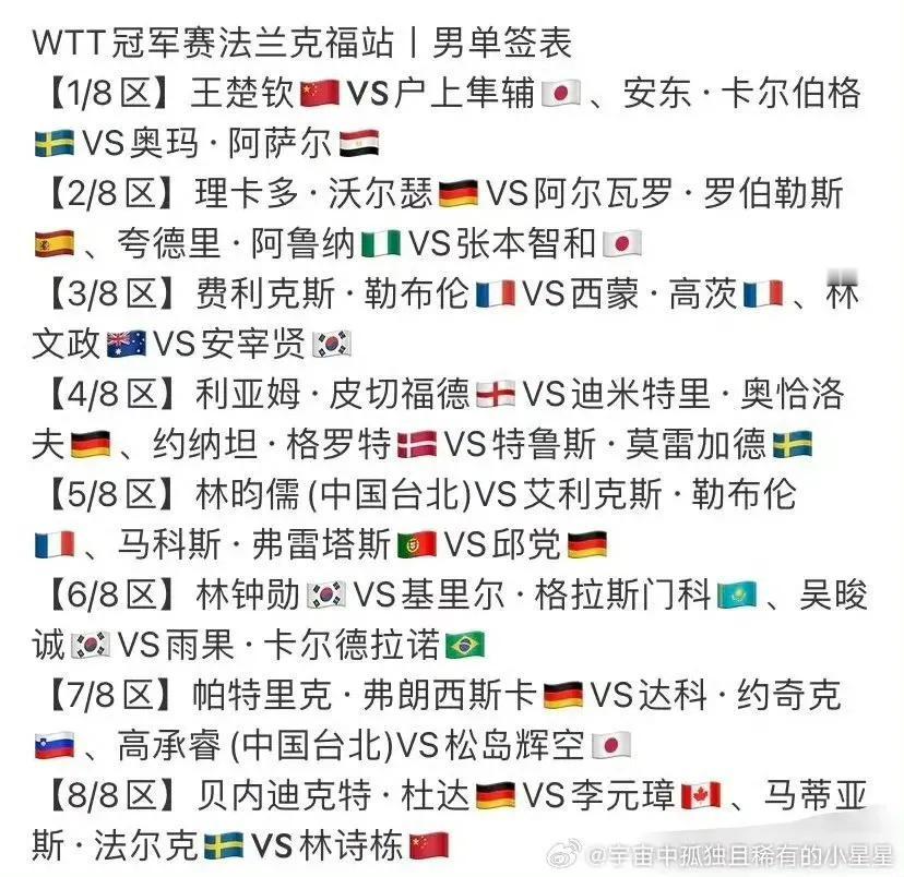 刚刚W TT法兰克福的男单签位表出炉。王楚钦不愧是世界第一,到了机场有专车接送。 想不到抽到的签位也如此的硬,所有的名将几乎全部都集中在上半区,说是死亡半区或者神仙打架,哪一个都不为过 大头首轮将对阵户上隼辅,除此之外张本智和,小勒布伦,莫雷加德,所有能够叫上名的,名将一个不少全部都在。上半区绝对是一场硬仗 下半区的话,小石头一人独守。名将全部都集中在上半区,所以下半区来说相对轻松一些 光看这个签位表就感觉此次收视率必然爆棚,还是那句话,大家一人一句给大头给国乒加油