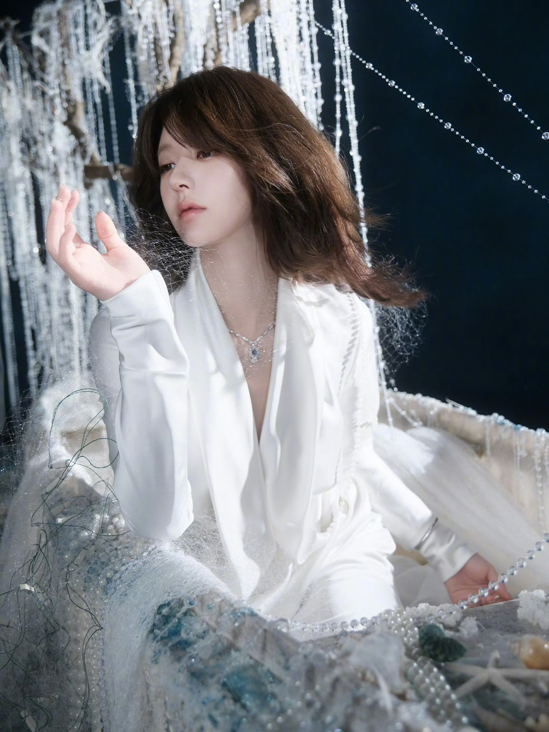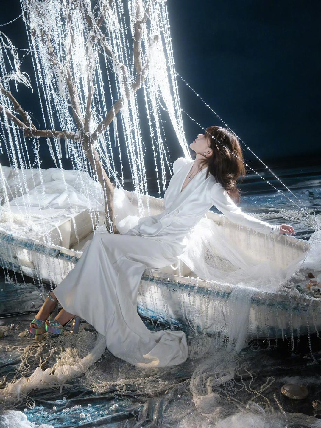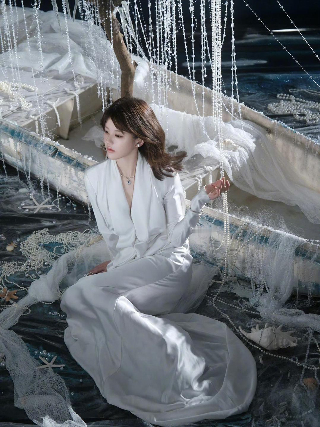 珍珠布景➕丝绸连衣裙,赵露思这身妆造和景也太搭了吧!!![好喜欢][好喜欢][好喜欢]