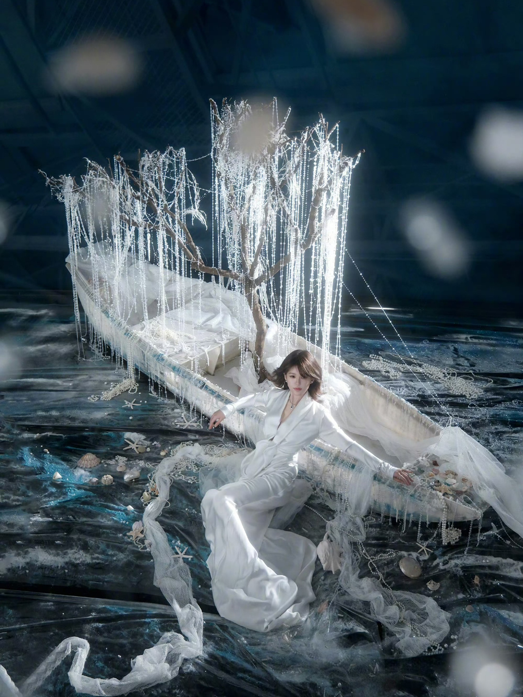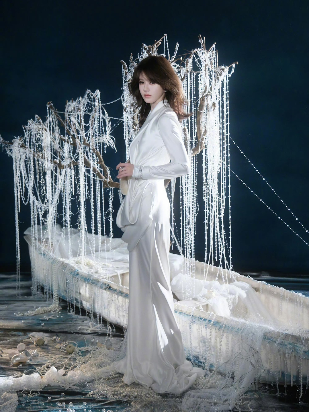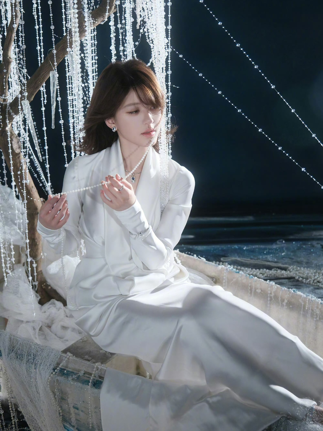珍珠布景➕丝绸连衣裙,赵露思这身妆造和景也太搭了吧!!![好喜欢][好喜欢][好喜欢]