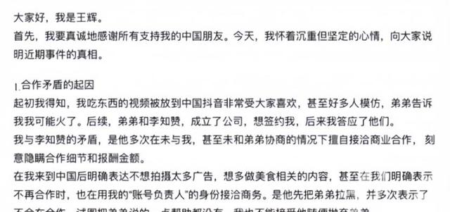 6月22日,王辉说他来中国拍视频想的是,只怕美食不拍广告,但是李知赞却一直在用负责人身份接广告,并且还有刻意隐瞒合作细节等等行为。