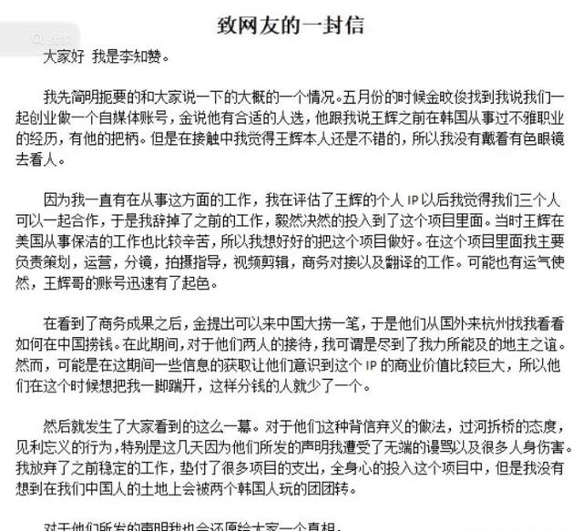 长文中说道,在五月份霸总王辉和另一个合伙人两个韩国人,找到中国人李知赞想要与他合作,三人一起在中国做账号挣钱。