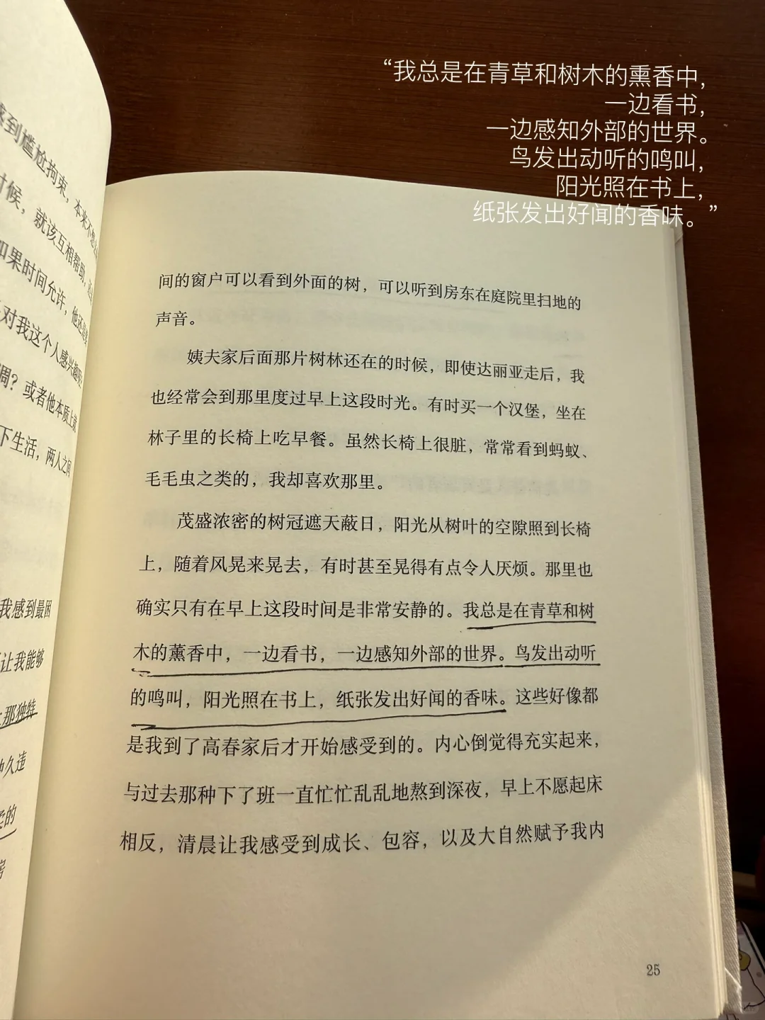 “我总是在青草和树木的熏香中,一边看书,一边感知外部的世界。鸟发出动听的鸣叫,阳光照在书上,纸张发出好闻的香味。