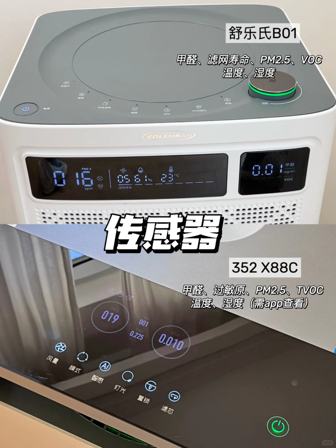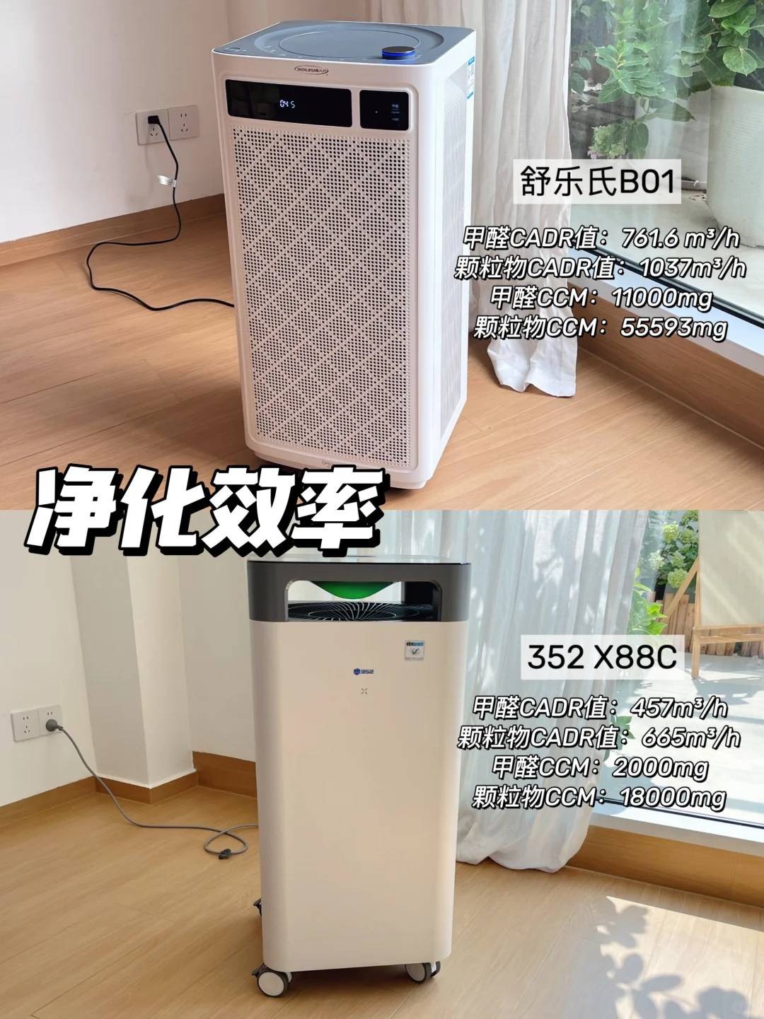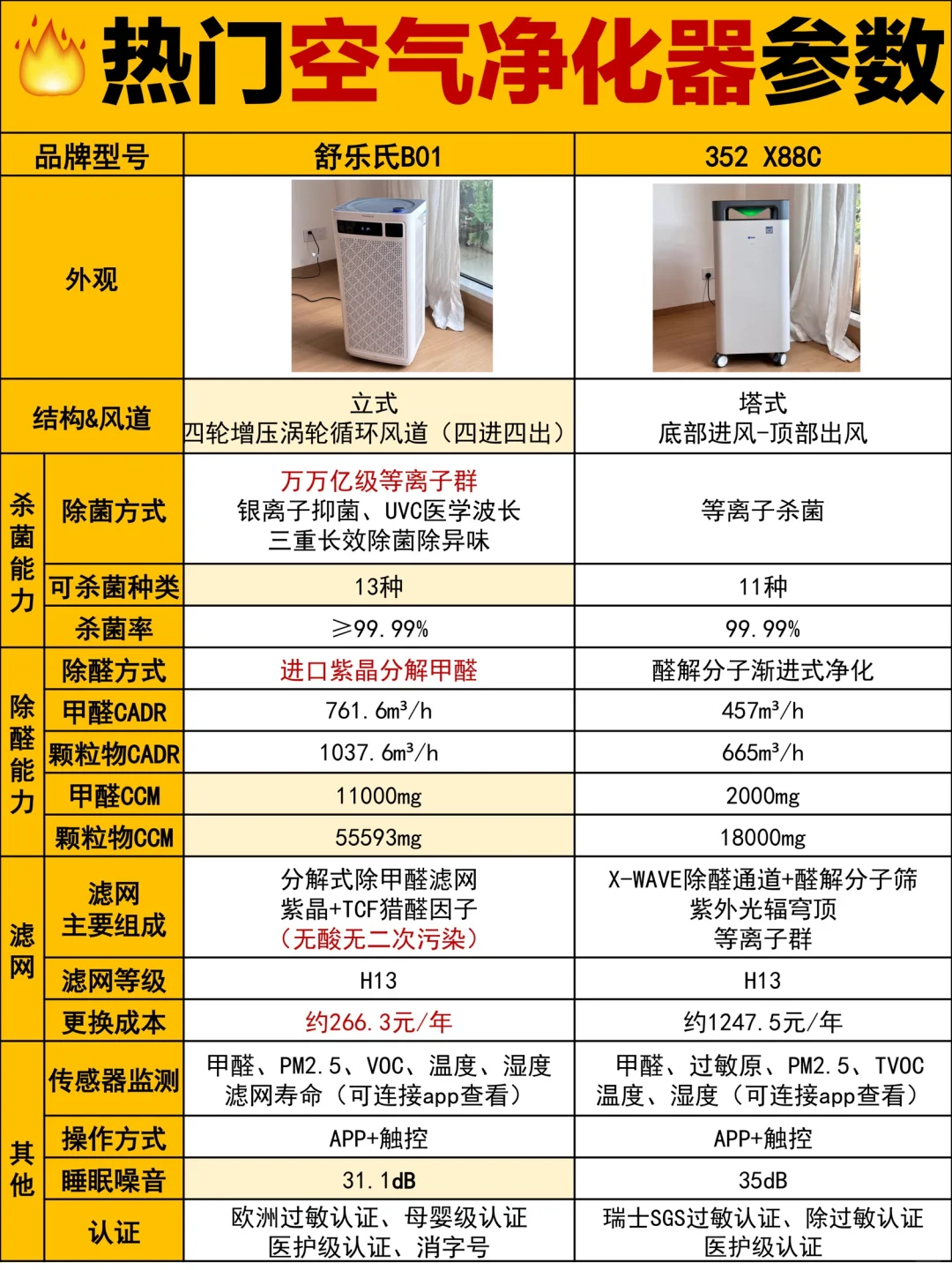 🌈我选了市面上比较热门的立式结构空气净化器舒乐氏B01、塔式结构空气净化器352 X88C进行时实测,具体参数可看图表。