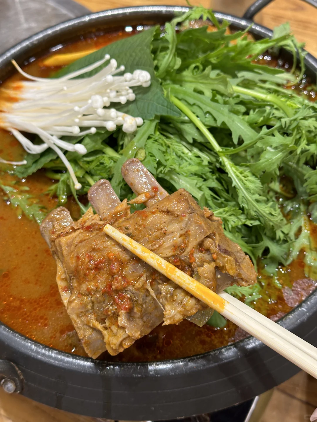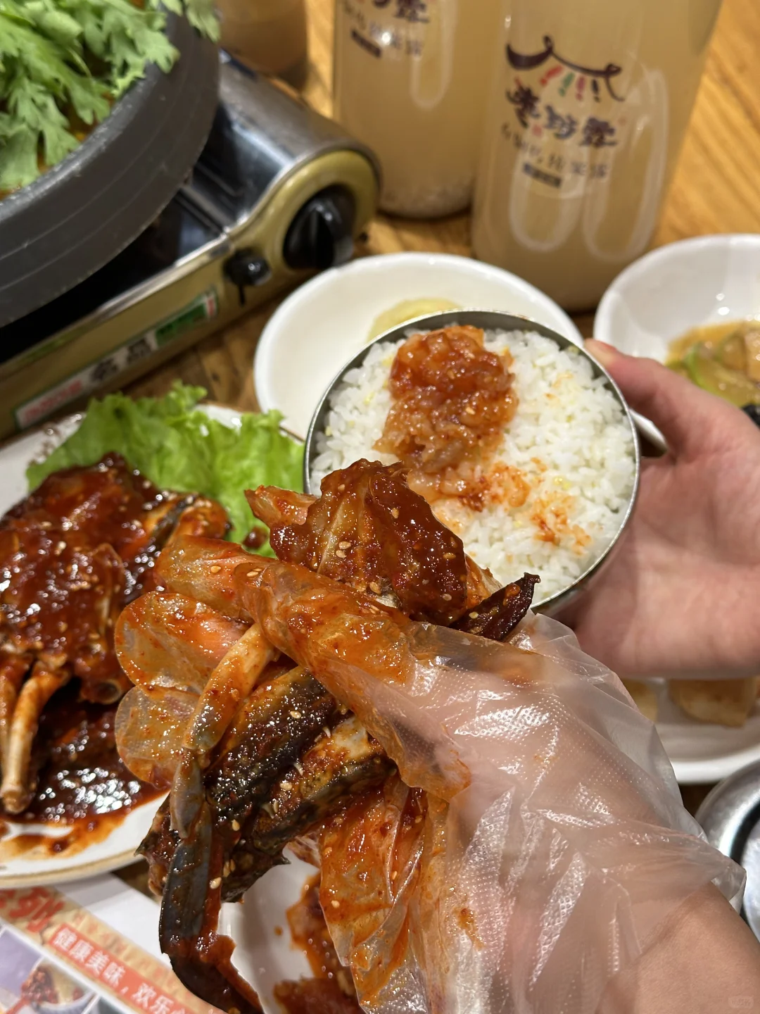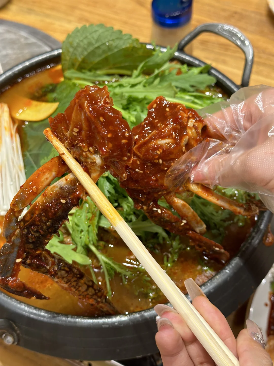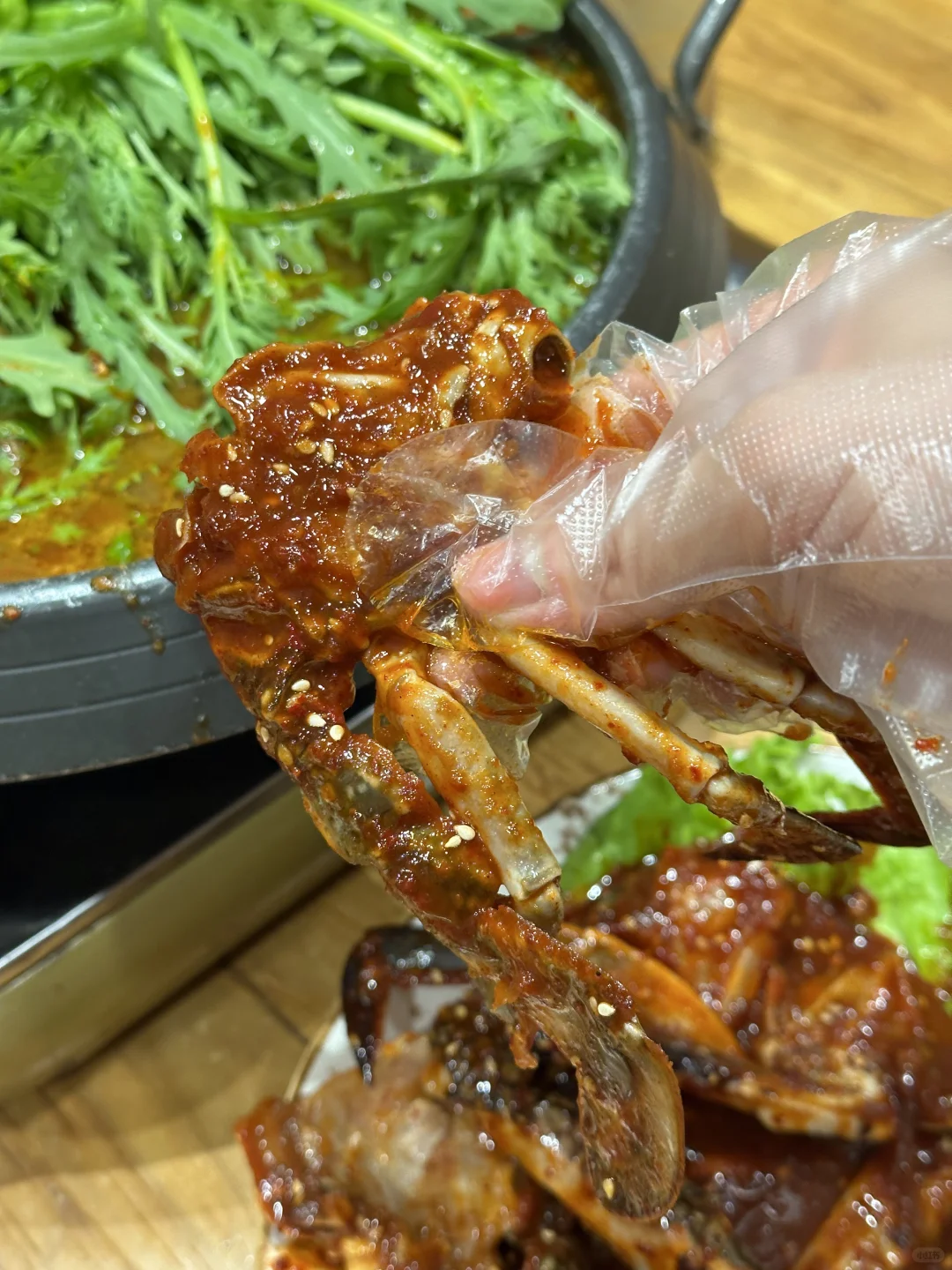 味道超正宗,就跟在韩国吃的一样。脊骨肉超多,搭配各种蔬菜,再配碗米饭,香得很!酱辣蟹也新鲜,蟹肉果冻般的口感和醇厚酱料绝配,简直就是米饭杀手!