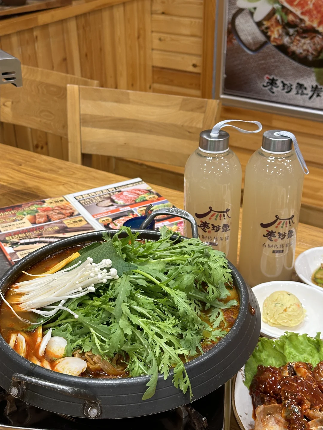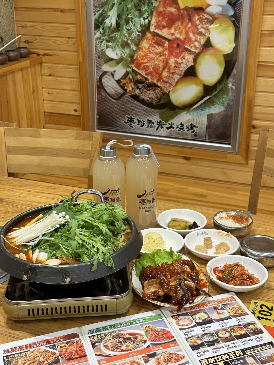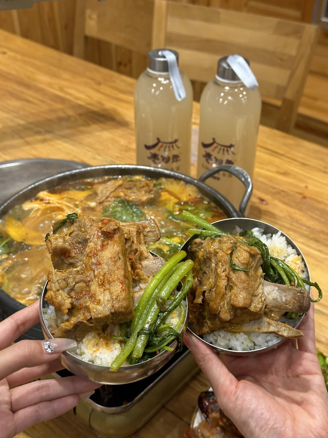 我俩点了小份脊骨锅和特色酱辣蟹,阿姨还上了好几碟小菜,送了免费大麦茶。脊骨锅量超大,有菜有肉我俩吃的特别满足😌