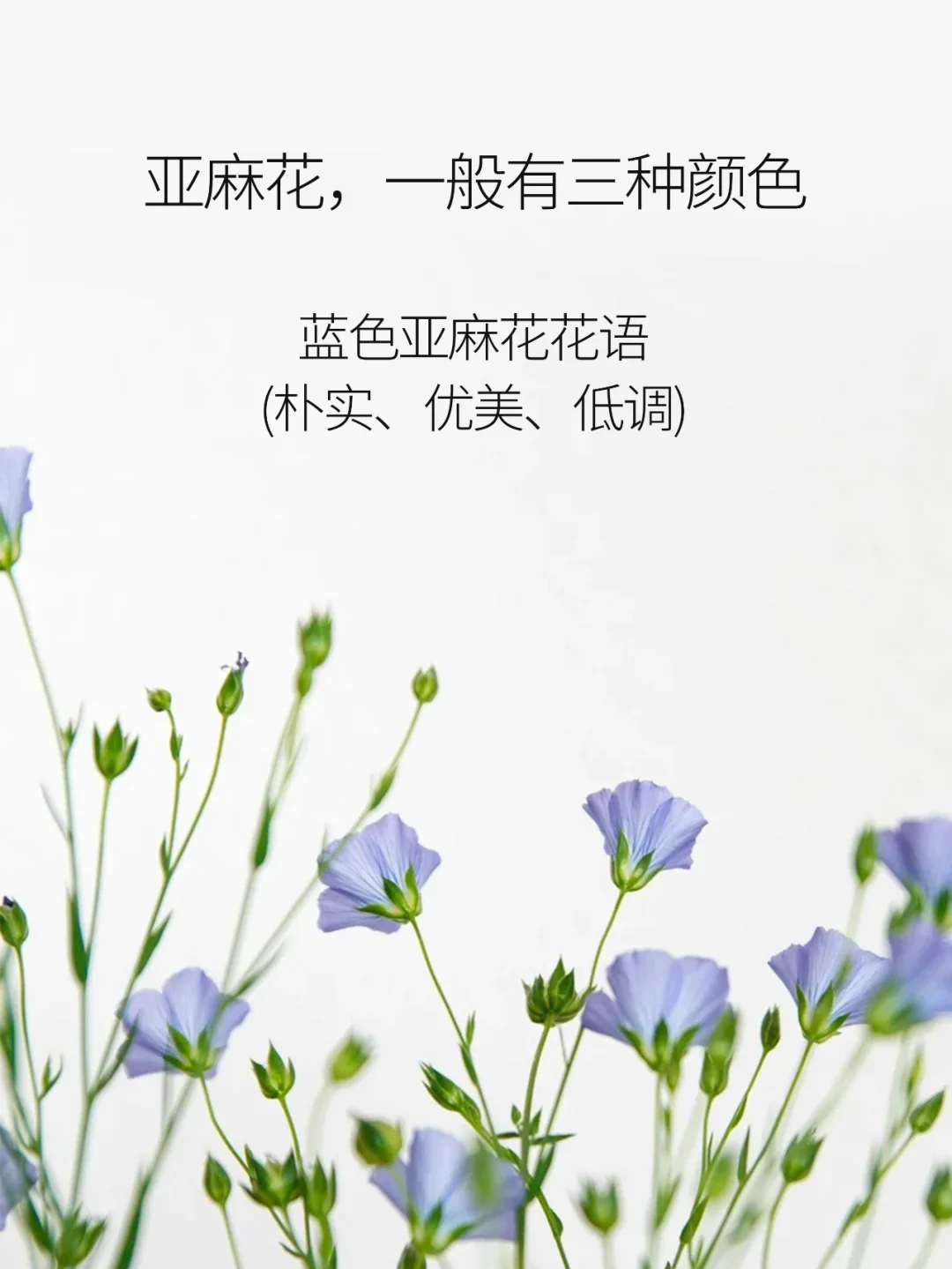 【亚麻·花语】 亚麻花,一般有三种颜色 蓝色亚麻花花语是朴实、优美、低调; 白色亚麻花的花语是纯洁、恬淡; 红色亚麻花的花语是热情、积极向上、活力四射。