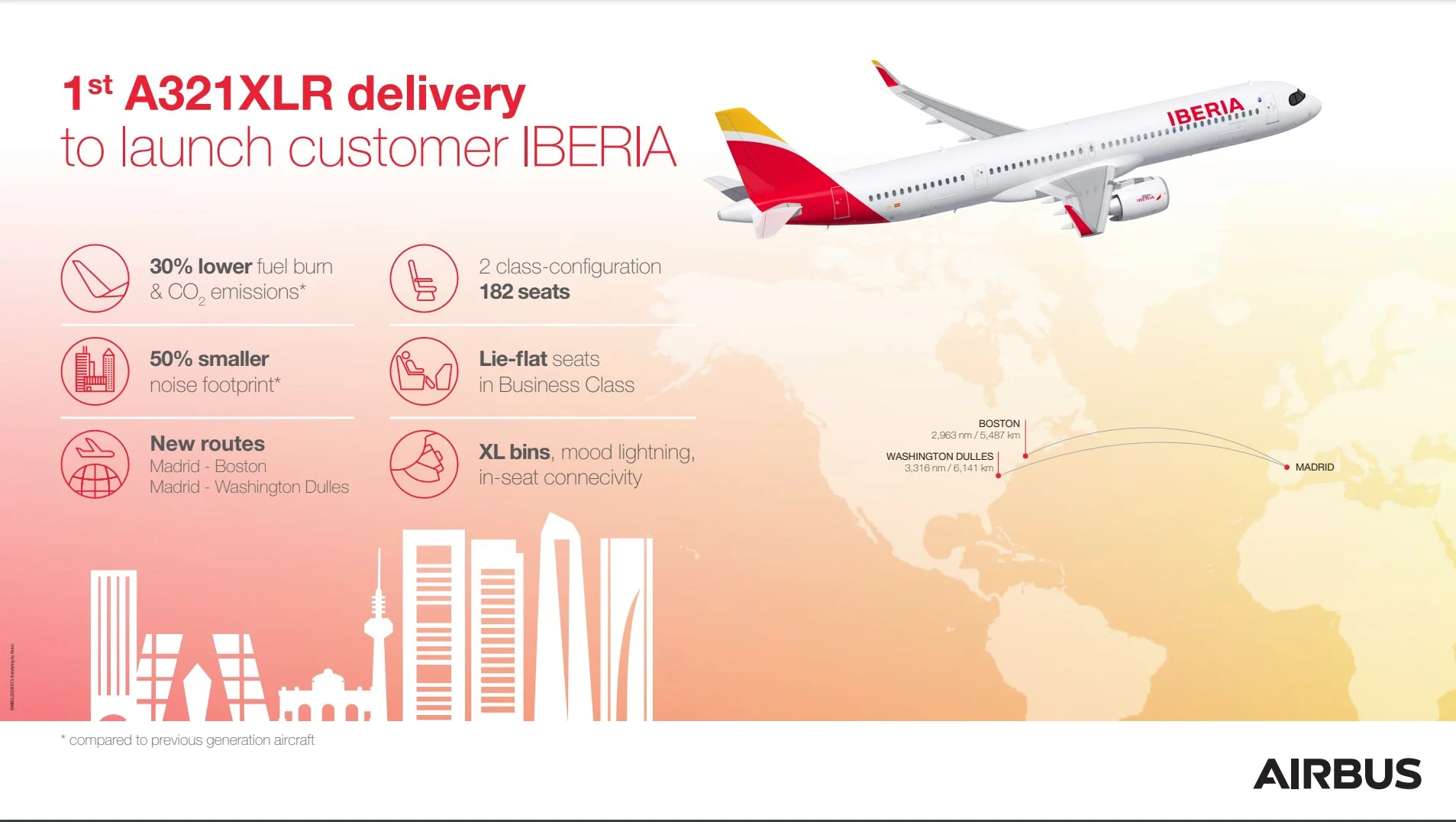 2024年11月1日,西班牙伊比利亚航空(Iberia)接收首架空客超远程型A321XLR飞机,成为这款全新单通道飞机的启动运营商。