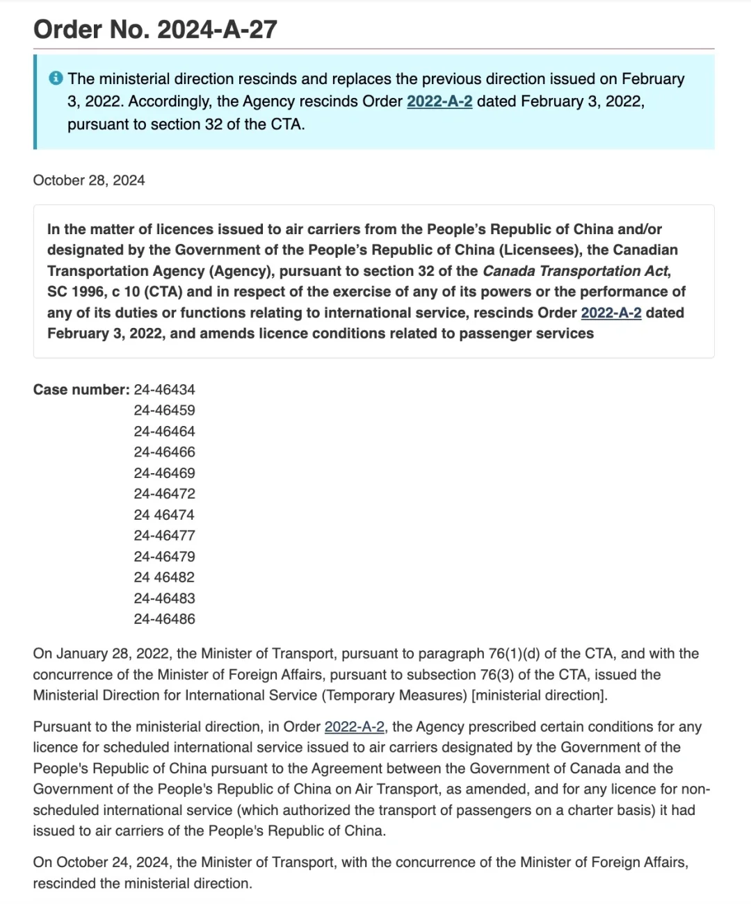 去加拿大交通署的网站看了下,确实有关于撤销相关限制措施的决定。决定号是 Order No. 2024-A-27
