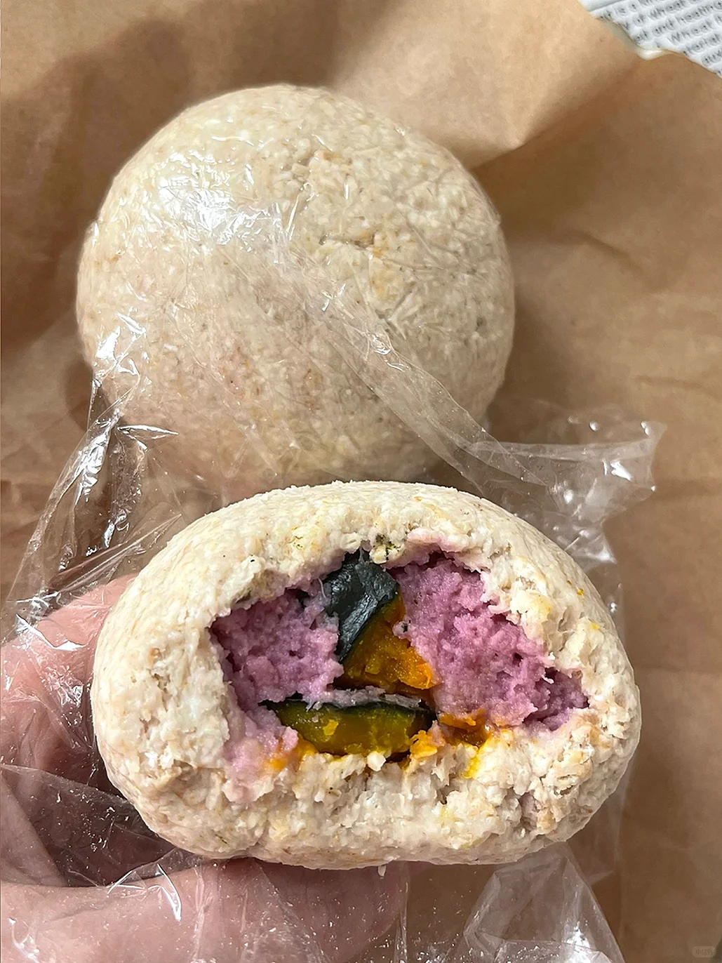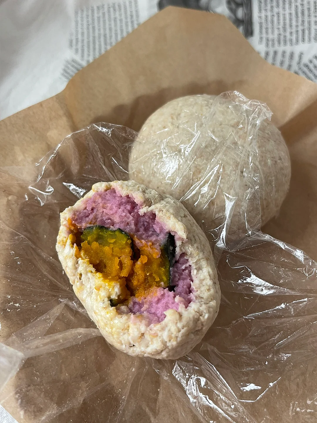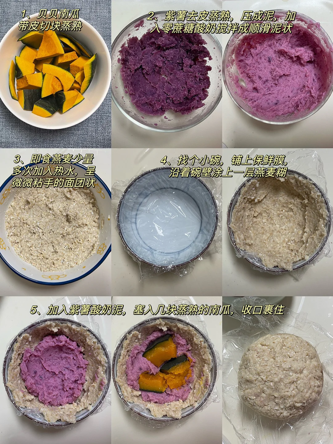 1⃣️青贝贝南瓜带皮切块蒸熟;紫薯蒸熟成热压成泥