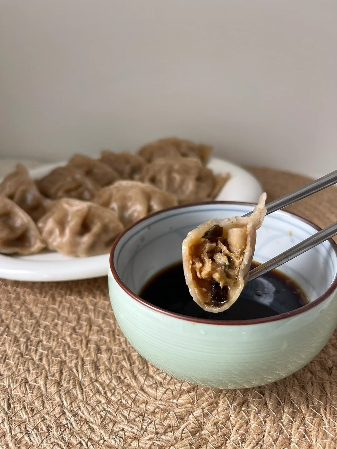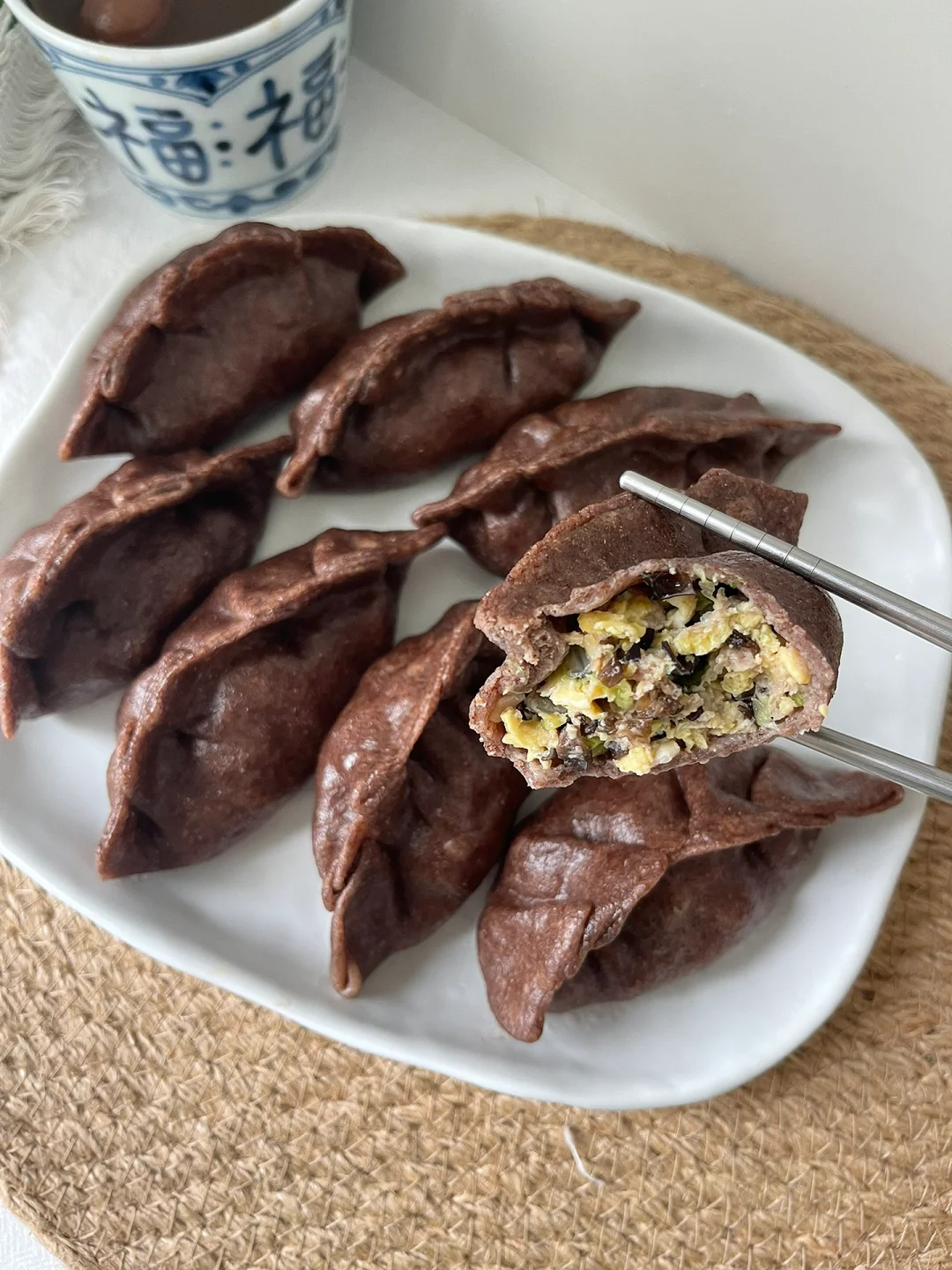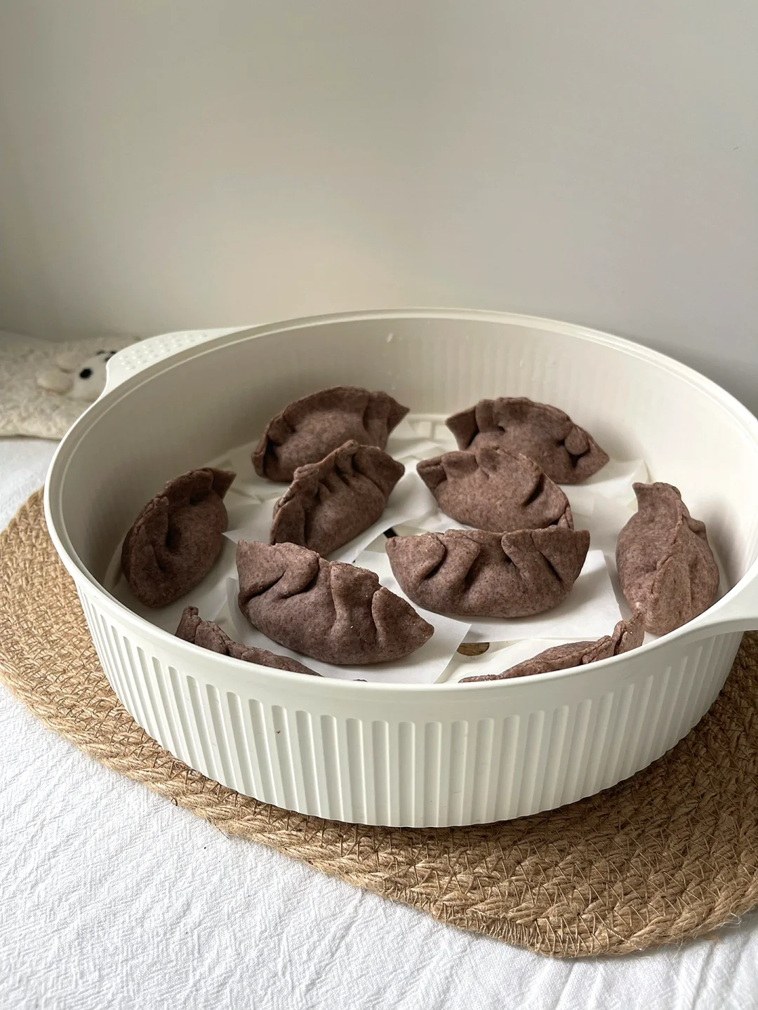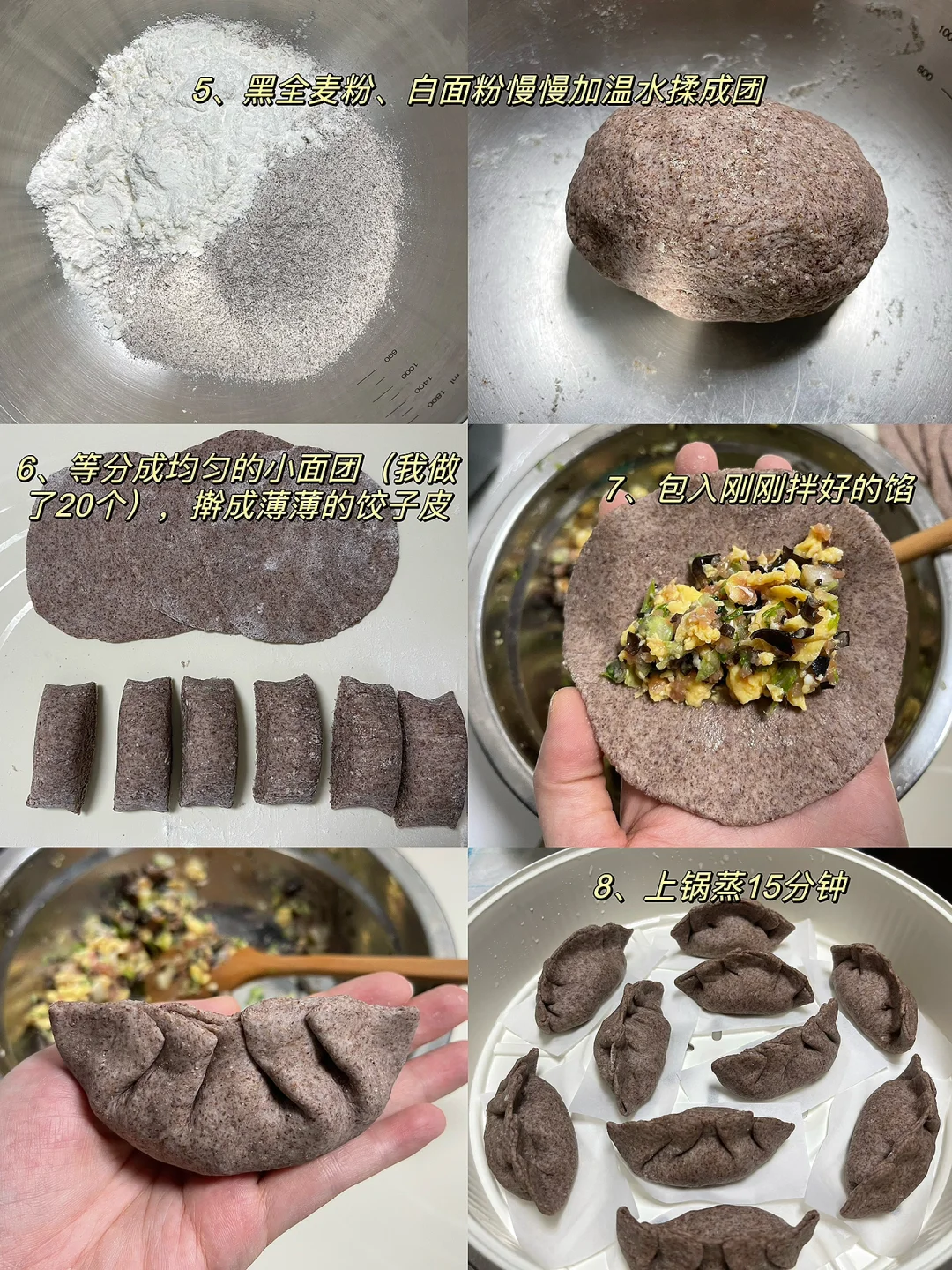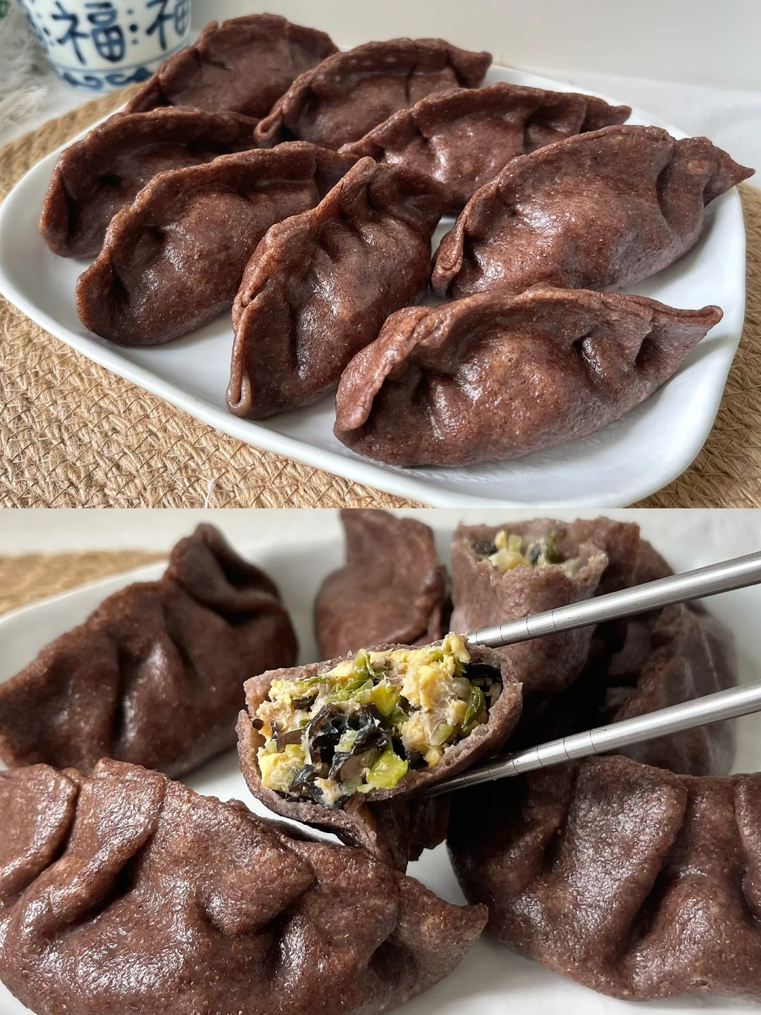 [向右R]很喜欢吃饺子,平时自己会买魔芋饺子欺骗下肚子。今天自己照葫芦画瓢地做了黑全麦饺子皮,健康的黑皮肤看着就适合咱减脂的宝宝们!