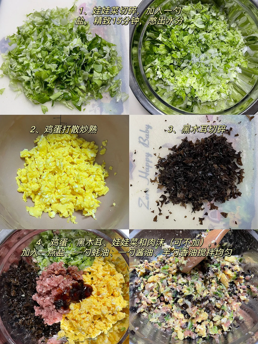 馅料:黑木耳、鸡蛋、娃娃菜、猪肉(鸡肉、牛肉)、蚝油、酱油、盐、香油