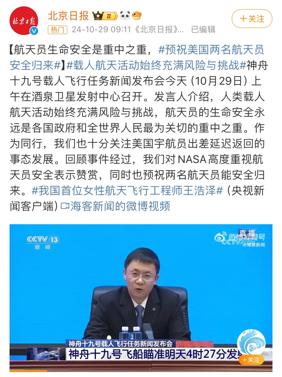 作为同行,我们也十分关注美国宇航员出差延迟返回的事态发展。回顾事件经过,我们对NASA高度重视航天员安全表示赞赏,同时也预祝两名航天员能安全归来。