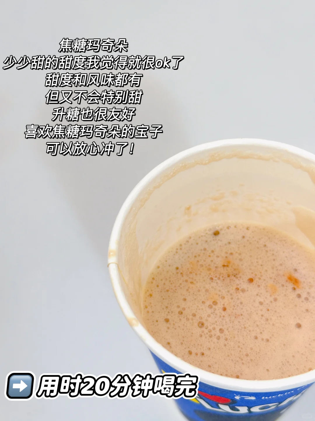 焦糖玛奇朵少少甜的甜度我觉得就很ok了,甜度和风味都有,但又不会特别甜,升糖也很友好〰️喜欢焦糖玛奇朵的宝子可以放心冲了!