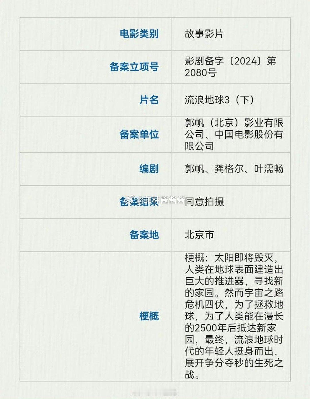 #流浪地球3备案完成##流浪地球3分上下两部# 流浪地球3备案