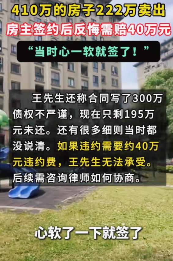 “亏大发了!”杭州,一男子把410万的房子挂在网上售卖,在中介的极力邀请下,他带着买家看房子,谁料,买家找各种毛病,只愿意出价222万元购买,男子心一软,便签下来合同,事后,男子反应过来自己亏损188万时,想要返回,却被告知需要支付给买家40万违约金,网友:这哪是心一软,明明是心一横! 王松(化名)听着买家诉说着房子的各个毛病,心里可真不是滋味,要不是需要用钱,他也不会把这套房子给卖了。 他之所以带这名买家来看房子,还是被中介给忽悠过来的,对方信誓旦旦的表示这套房子的价格只会高于他的预期,这句话让王松兴致冲冲,谁不希望自己能够高价卖出房子呢? 但是买家对房子十分挑剔,王松知道这是为了压低房价,但这套房子他购买时,花费了400多万,承载着他对未来美好生活的憧憬。 不过市场行情低迷是不争的事实,他希望能够尽快回笼资金,可中介的言辞和买家的质疑,让他逐渐失去了信心,开始怀疑自己的判断。 买家最终报出了222万元的价格,这个数字远低于王松的心理预期,他内心极度挣扎,他知道这个价格意味着巨大的损失,几乎是腰斩的价格。 但他被中介营造的焦虑氛围所裹挟,被买家挑剔的目光所动摇,最终他签下了合同,签字的那一刻,他仿佛听到了心碎的声音。 直到他回到冷清的家中,才如梦初醒,188万的损失,让他瞬间清醒过来,这是他多年辛勤工作的积蓄,是无数个日夜的汗水换来的成果,如今却因为一时的冲动,付诸东流。 悔恨如潮水般涌来,他彻夜难眠,反复思考着如何挽回损失,于是他不想把房子给卖了,就想着和买家商量商量,但合同上表示,卖家违约,需要支付给买家40万的费用。 40万对于他来说是一笔不小的数目,这件事情在网上掀起轩然大波,有人劝他支付违约金,毕竟跟亏损的快200万相比,这点损失已经很小了。 但也有人认为要是急需用钱,卖掉也行,至少还能回个本,但是想要不亏损基本是不可能的事情,签合同的时候,是他自愿的,没人强迫,所以要承担后果。 对于这件事情,大家有什么看法? 信息来源:e昆山《近日,杭州王先生卖了房子却反悔,称自己亏了200万元……》2024年11月6日