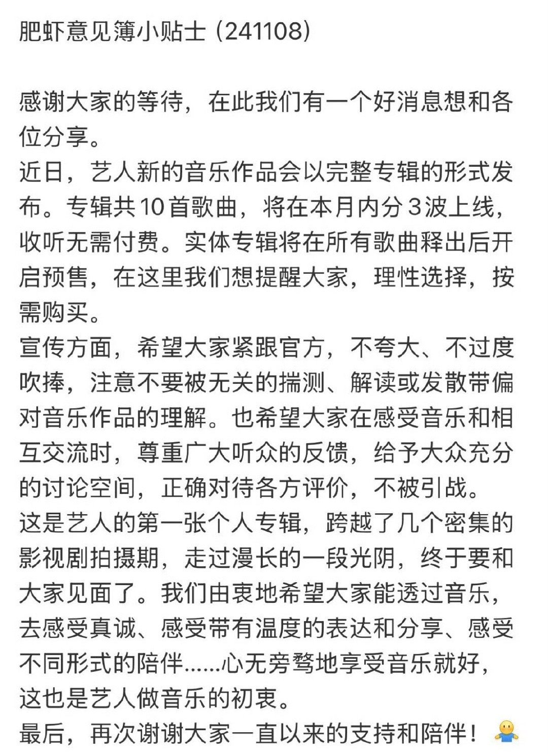 肖战对接回应肖战即将发布个人专辑🈶专辑共10首歌曲,本月内分3波上线收听无需付