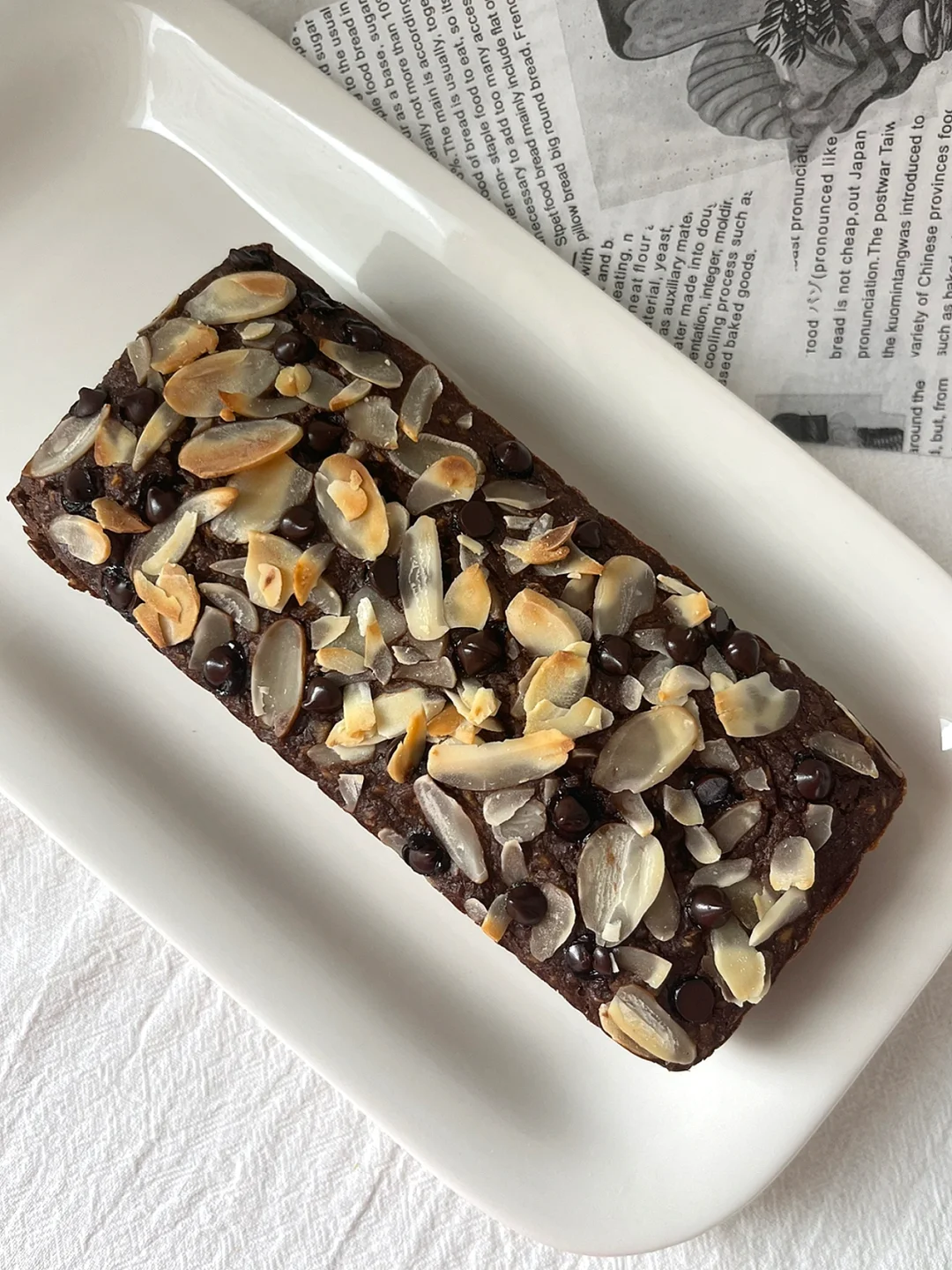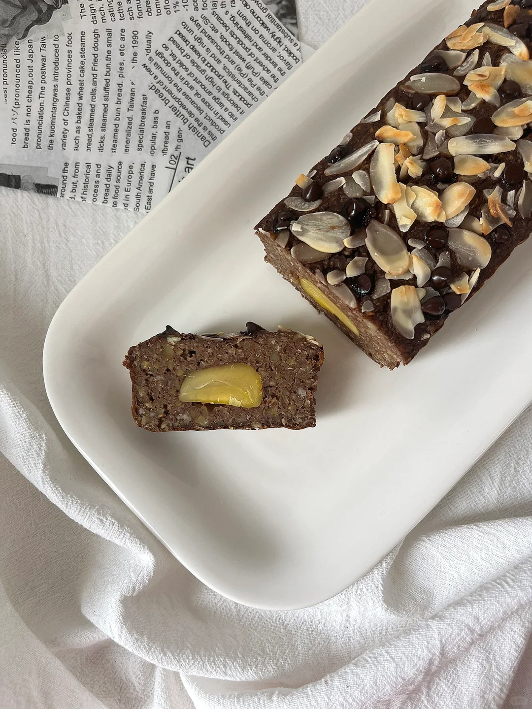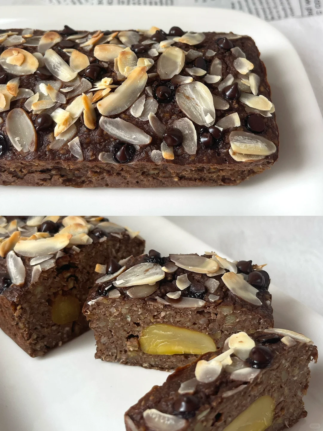 4⃣️表面撒上杏仁片和黑巧克力豆,烤箱180度25分
