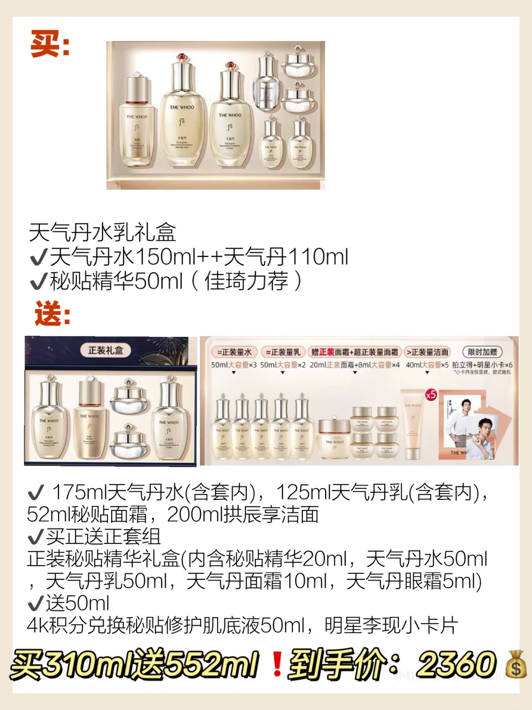 ✔️175ml天气丹水(含套内),125ml天气丹乳(含套内),52ml秘贴面霜,200ml拱辰享洁面