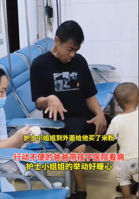 “这名护士火了!”广西桂林,一行动不便的父亲带着孩子到医院看病,孩子打完针后便哭闹不停,路人给孩子买了两个奶片,没过多久,护士小姐姐便端着一碗米粉,亲自喂孩子吃饭,本以为事情就此结束,谁料,护士接下来的举动,让这名父亲泪目了! 6月26日,莎莎(化名)走进医院的大厅,她的目光不经意间落在一个角落里,那里有一位行动不便的父亲,旁边还有个孩子在输液,他就静静地陪在孩子身边。 孩子的脸色苍白,眼神中透着几分无助,输液结束后,孩子突然哇哇大哭起来,父亲一时间手足无措,尽管他努力地安慰孩子,但由于行动不便,无法有效地给予孩子所需的关怀。 莎莎的心瞬间被深深触动,她想要帮助这个可怜的孩子,于是她买了两个奶片交给孩子,结果孩子吃到食物后,瞬间停止了哭声,可见孩子这是饿了。 父亲对莎莎表示感谢,没过多久,一名护士拿着饭赶到了孩子的身边,因为孩子还小,所以特意买了比较清淡的米粉。 父亲因为双手不受控制的发抖,没有办法喂孩子吃饭,护士见状,毫不犹豫地将饭盒打开,随后耐心的喂孩子,孩子也很配合,乖巧的张嘴吃饭。 这一幕让在场的所有人都感到动容,医院的氛围在这一瞬间变得温馨而感人,护士的细心与耐心,展现了医护工作者的责任与关怀。 她的每一个动作都充满了温暖,尽管生活中有许多困难,但总会有人愿意伸出援手,孩子渐渐安静下来,脸上露出了满足的表情,似乎在这一刻,她感受到了爱的温度。 而护士还在工作群中发布了关于这名父亲的情况,向同事们寻求帮助,希望能够为这个家庭提供更多的支持。 要是同事有小孩不穿的衣服,这名孩子能穿的话,可以把衣服赠与两人,护士的这一举动,迅速引起了同事们的关注,不少人表示愿意伸出援手。 生活中虽有无数的困难与挑战,但只要我们互相帮助,就能给予生活在困境的人一丝温暖。 对于这件事情,大家有什么看法? 信息来源:南阳网《行动不便的爸爸带孩子医院看病,护士小姐姐的举动好暖》2024年6月26日