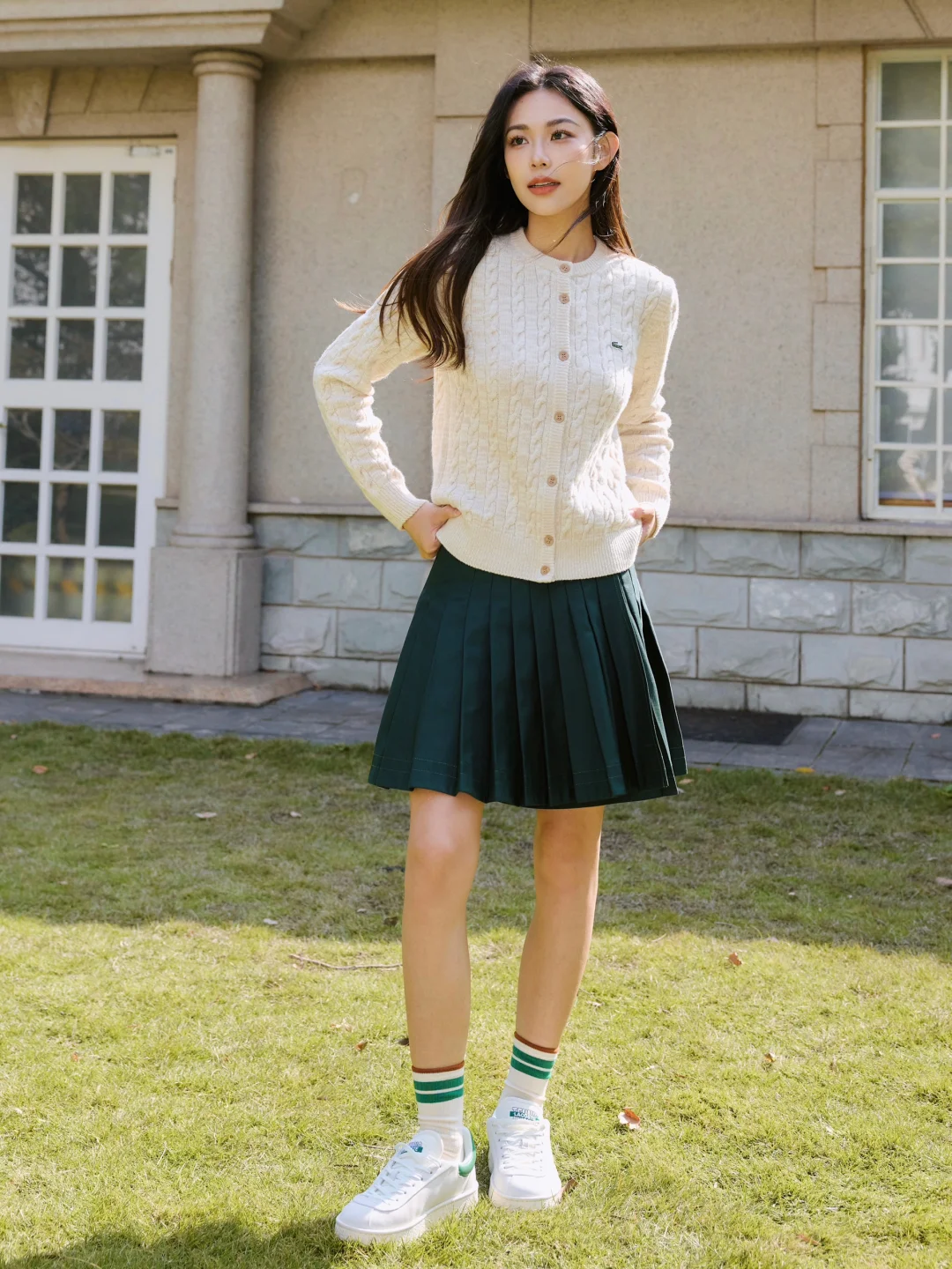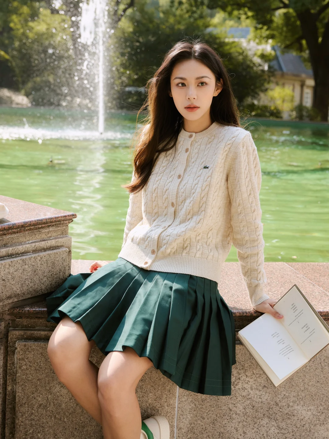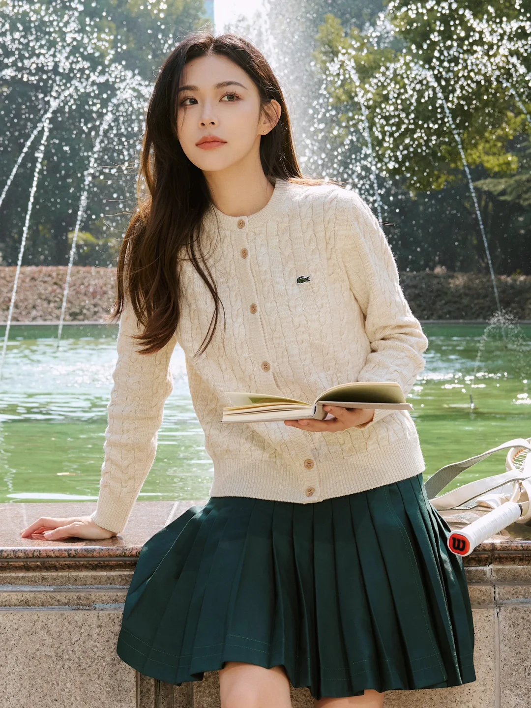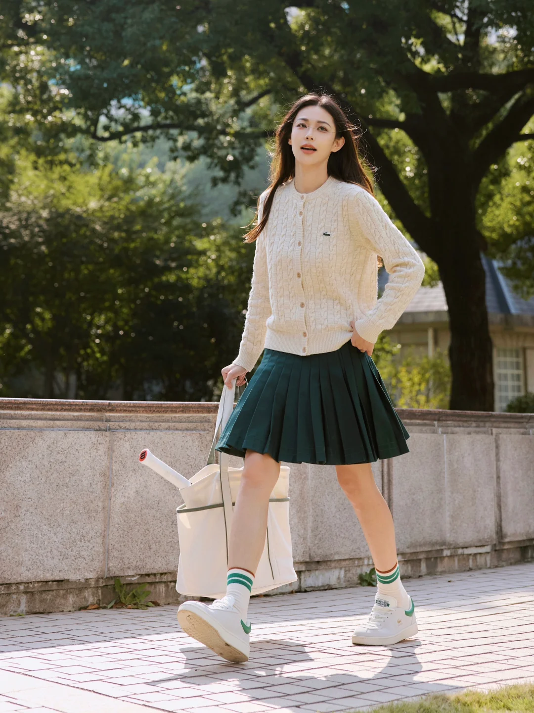 经典的燕麦色毛衣开衫搭配墨绿色网球百褶裙很有tenniscore即视感