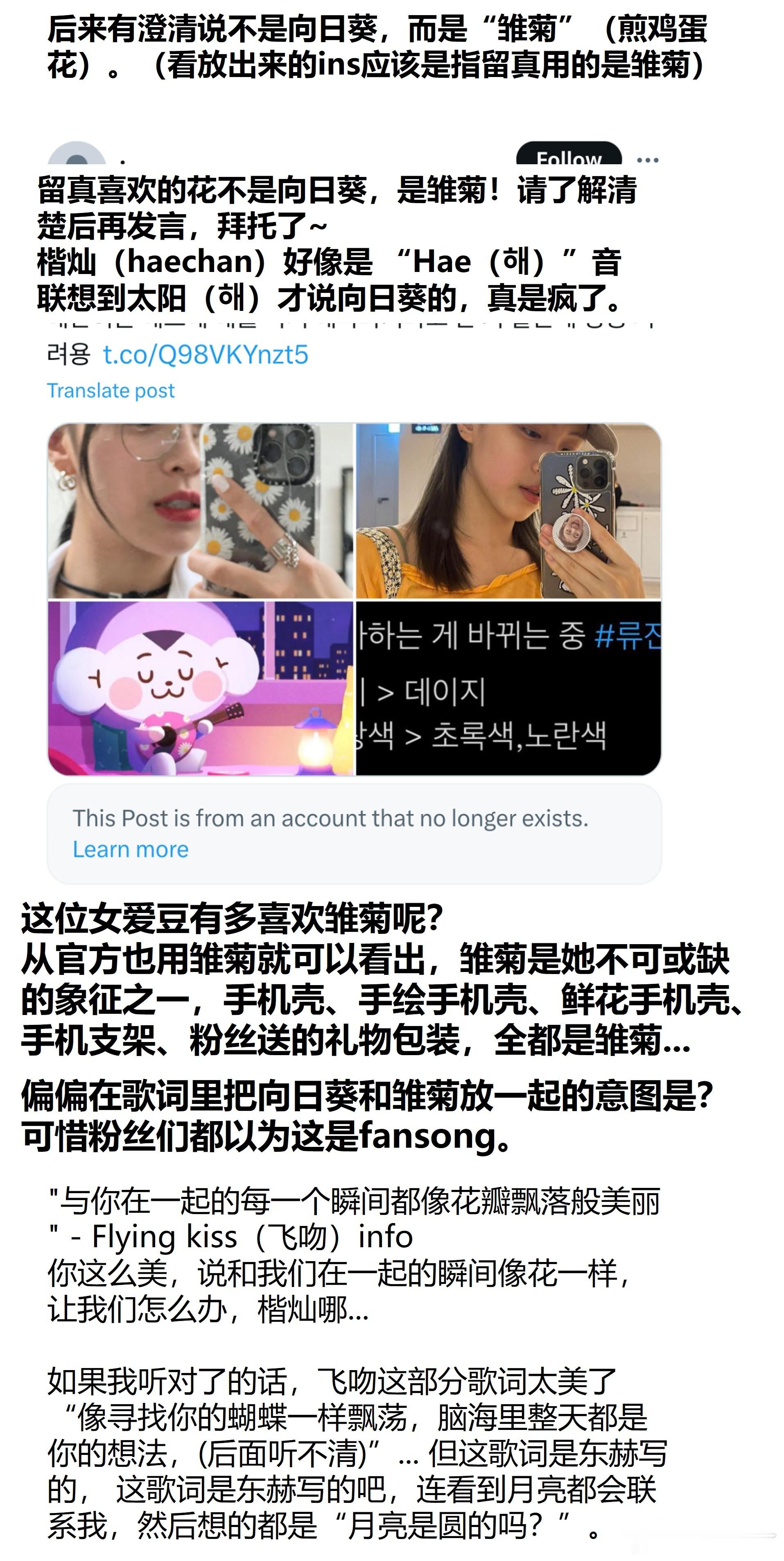 楷灿参与作词的NCT DREAM这次回归曲flying kiss歌词疑似是通过向日葵和雏菊示爱留真(向日葵可以代表楷灿,雏菊是留真很喜欢的花)