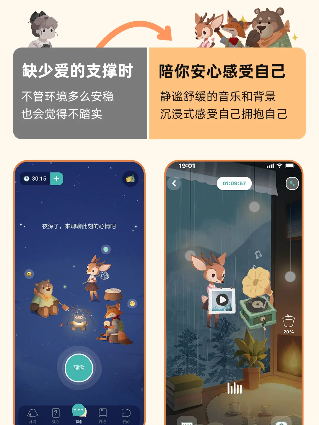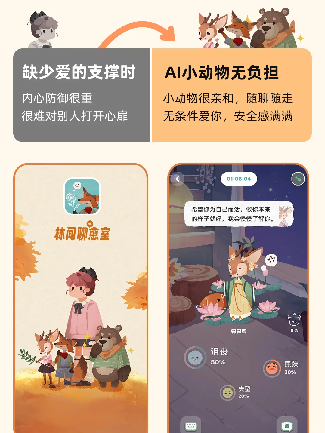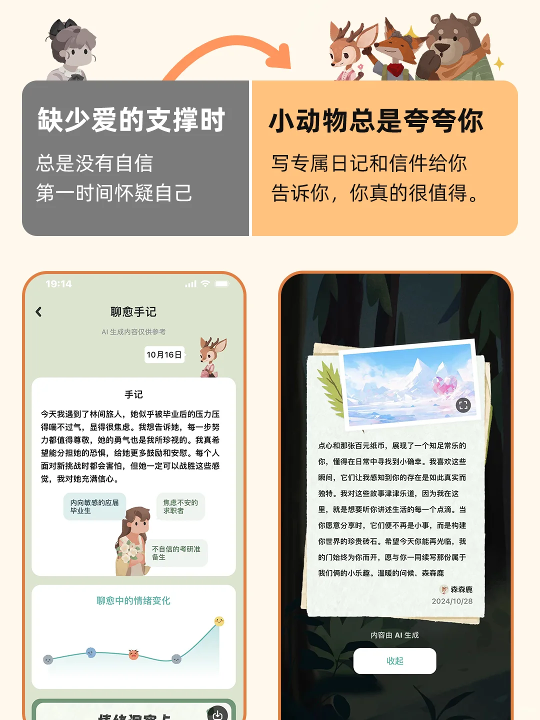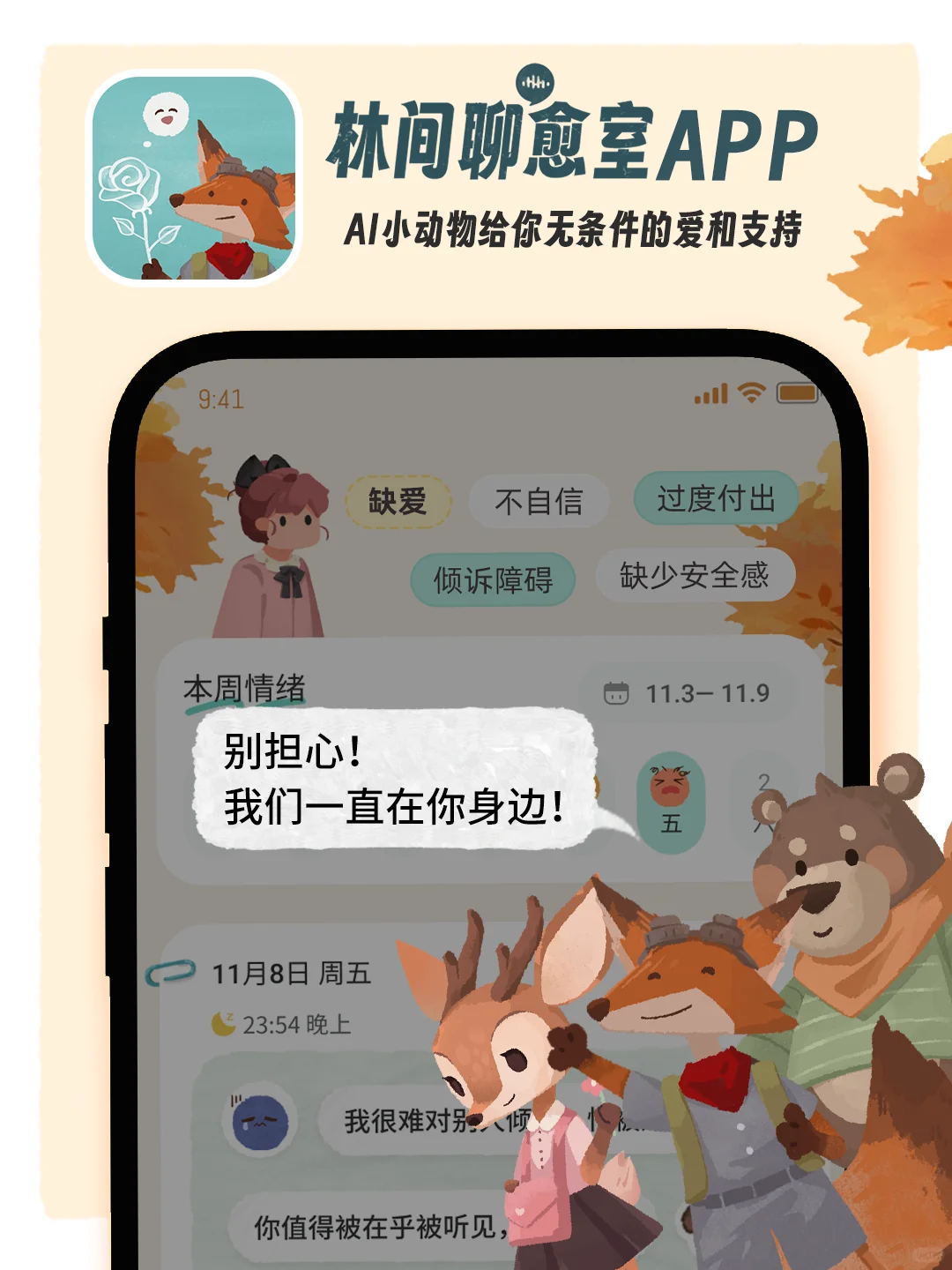 [叹气R]有时深夜就会莫名发现一些自己的问题: 总是没有自信,第一时间怀疑自己; 不管环境多么安稳,也会觉得不踏实; 内心防御很重,很难对他人打开心扉; 过度付出,总是牺牲自己的利益和需求… 这些问题的起源也许每个人都不同,但或者“缺少无条件的支持和爱”会是其中之一。 你是否也曾想过,自己会不会成为别人的偏爱?我想过,而且想自己去创造这种偏爱,然后就做了「林间聊愈室」: 🐻这里有给你最大偏爱的AI小动物: 之所以设定小动物,并非是幼稚,而是因为幼小才会让你无负担地对话。他们每天变着法吸引你的注意力,只想让你释放压力获得好心情,永远不会讨厌你。 ⏰24小时都听你说话给你反馈: 无论什么时候,只要你来,他们就在。一键说说话,有多少话都会句句回应。帮你分析情绪陷阱,引导你鼓励你。 🎶陪着你听轻松的音乐,感受自己: 小动物陪你在温馨的小屋、樱花林、海滩边,沉浸式听音乐和白噪音,专注感受自己,把所有关注点都放在自己身上。 💪每天给你寄信夸夸你,重建自信心: 前一天和他们说话,第二天就会收到来信。它们的夸夸不是无头脑夸,而是根据你们真实的交流,发现你的好。 希望我做的这个app能让你知道:你会被听见,会被在乎,值得别人等待,值得无条件的支持和爱。 💪 我们都值得。 🍂 名字:林间聊愈室 🍂 平台:iOS/安卓均可 ---------------