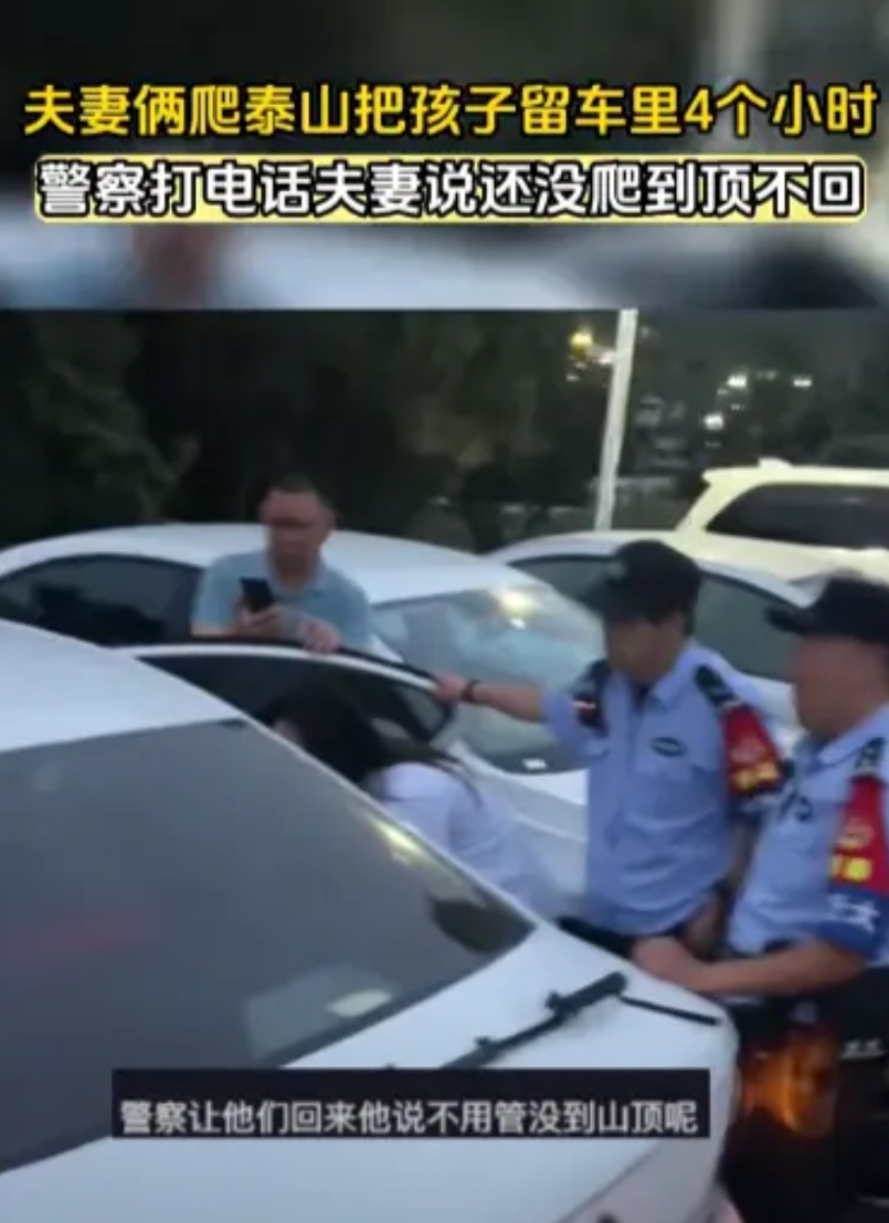 2023年,山东,一对小夫妻自驾游泰山,到了停车场后,觉得带孩子爬泰山太累人,便决定把3岁的儿子独自留在汽车内,为了防止孩子窒息,还特意打开车窗留了一条缝,后二人便上山游玩,孩子在车内独自待了4个小时。网友:“这对小夫妻能培训后再上岗吗?” 那天,阳光明媚,空气清新,一对年轻的小夫妻兴冲冲地自驾来到了泰山脚下,准备体验一场说走就走的登山之旅。 车内安静得只有轻微的呼吸声,他们三岁的儿子还在熟睡,嘴角带着一丝微笑,似乎在做甜美的梦。 看着孩子睡得香甜,小夫妻对视了一眼,心生一计:如果把孩子留在车里,让他睡个好觉,等自己登顶下来再接他,岂不是两全其美? “没事的,孩子睡一会儿,不会有事的。”丈夫低声说道,妻子点了点头,认为这个想法很合理。 于是,他们在车窗留了个小缝通气,确保车内不会过热,然后带上登山装备轻轻关上车门,兴高采烈地踏上了他们的登山之路。 时光飞逝,四个小时转眼就过去了,停车场上,寂静的车内传出一声声哭闹声,打破了周围的安宁。 孩子醒来后,发现父母不在,四周一片陌生,便开始害怕地大声哭喊。巡逻的民警听到哭声后,循声找到了车子,看到车内一个小小的身影在挥动着手臂,脸上满是泪水,眼神里充满了恐惧和无助。 民警赶紧上前查看,发现车门锁得死死的,孩子因长时间在密闭车内哭泣,脸涨得通红,额头冒出了细密的汗珠。 民警立刻拨通了夫妻俩的电话,语气中带着一丝责备和急切:“孩子一个人在车里,又热又害怕,赶快下来吧。” 然而,电话另一头,夫妻俩的回应让人无比错愕。丈夫轻描淡写地说:“我们还在爬山呢,快到顶了,现在不方便下来,别管他,他一会儿就不哭了。”
