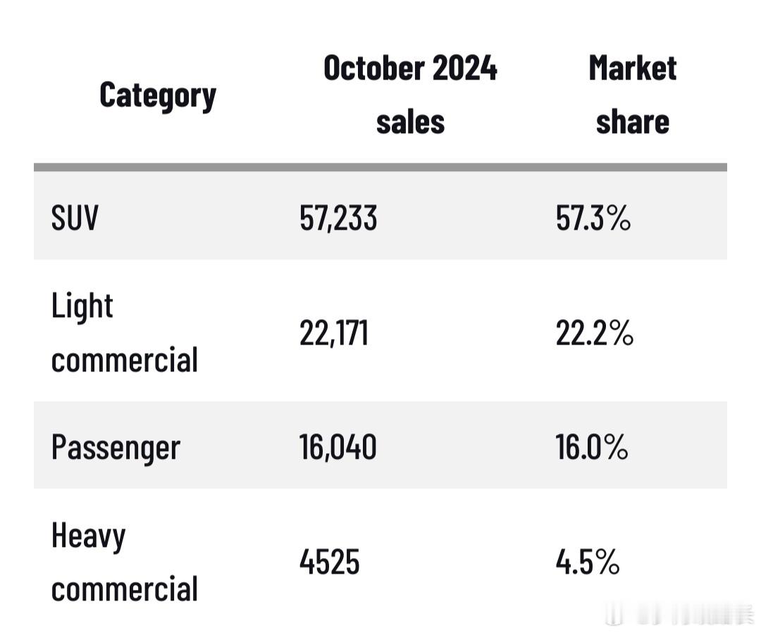 SUV份额57.3%,轻商22.2%,乘用车16%,重型商用车4.5%