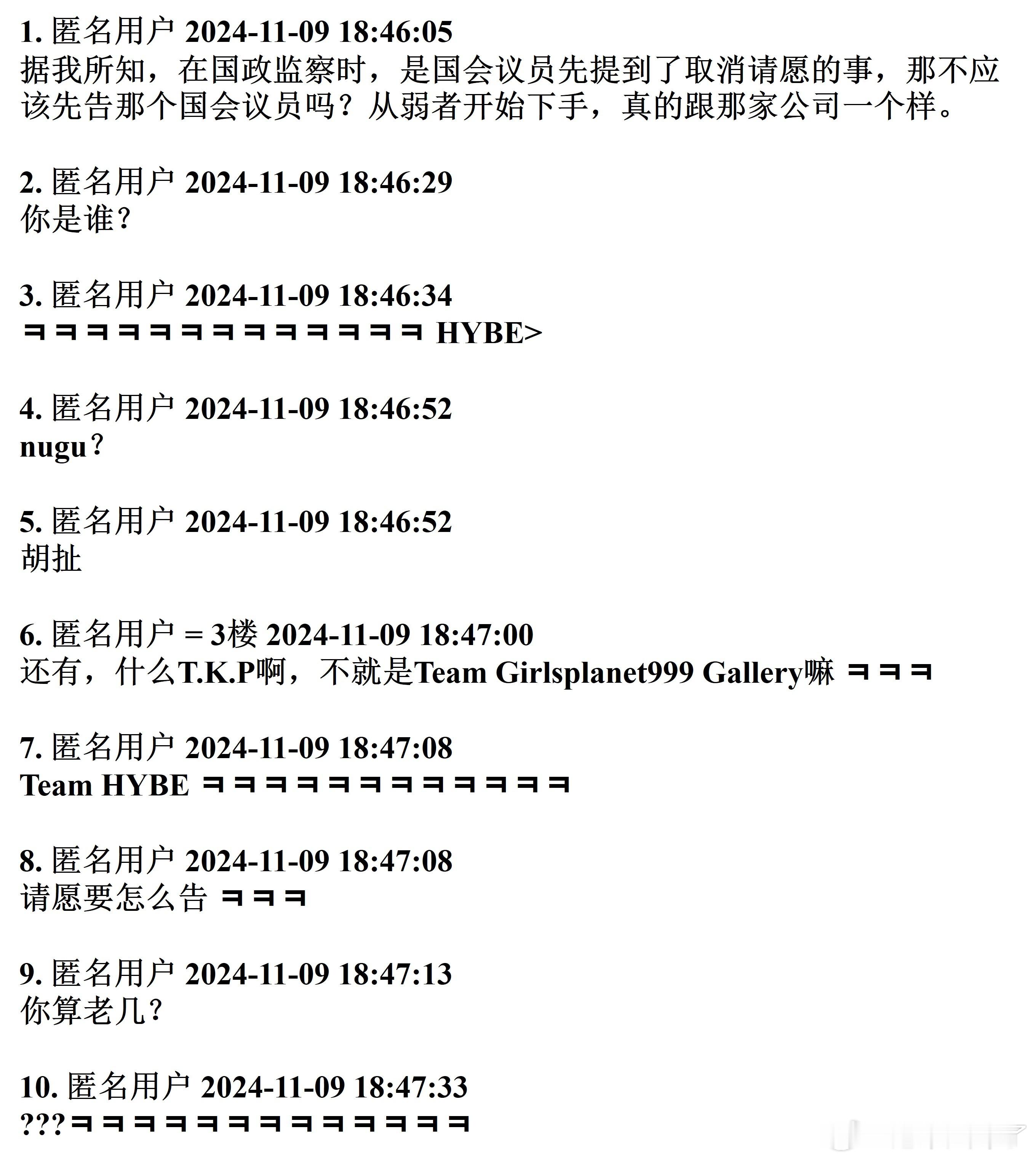 评论区目前基本表示你谁啊?对请愿起诉?是TEAM girlsplanet999 gallery吧?为什么不直接用HYBE官方帐户来?是在抄袭TEAM Bunnies吗?