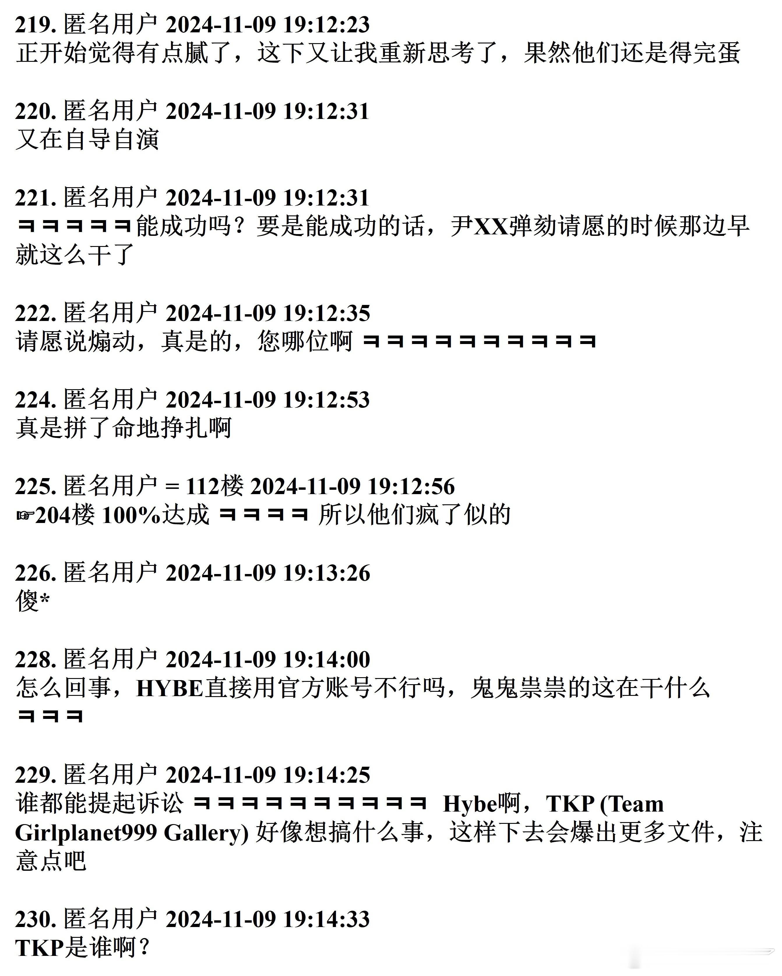 起因(图1)是T.K.P 推上po出要对以请愿煽动为由,对该K-POP公司(即HYBE)所属艺人、工作人员、粉丝群体造成数亿损失的“煽动者、参与者”,发布关于“妨碍业务及名誉损毁”刑事起诉的预告。如果超过1周不反悔就正式起诉。