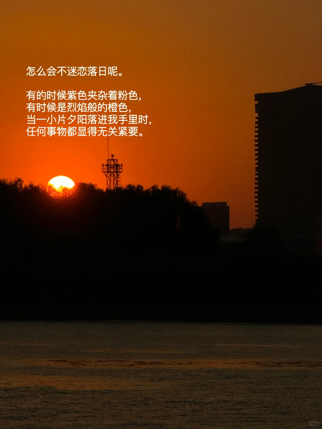 有的时候紫色夹杂着粉色,有时候是烈焰般的橙色,当一小片夕阳落进我手里时,任何事物都显得无关紧要。