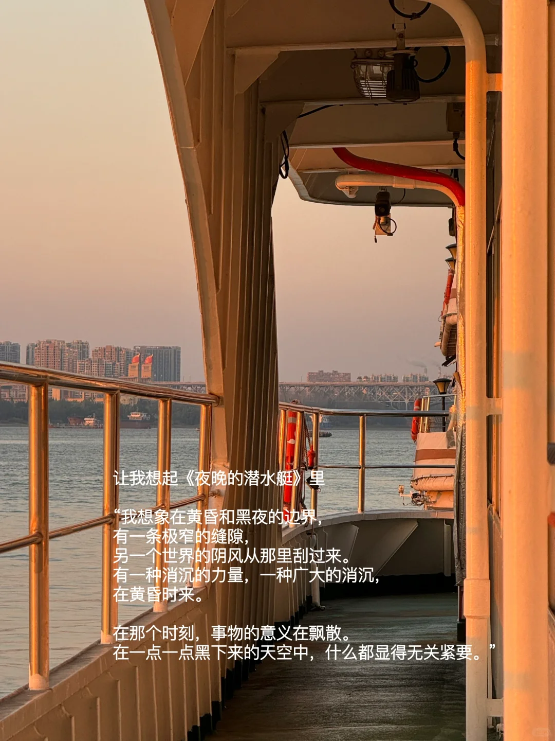 :“我想象在黄昏和黑夜的边界,有一条极窄的缝隙,另一个世界的阴风从那里刮过来。有一种消沉的力量,一种广大的消沉,在黄昏时来。在那个时刻,事物的意义在飘散。在一点一点黑下来的天空中,什么都显得无关紧要。”
