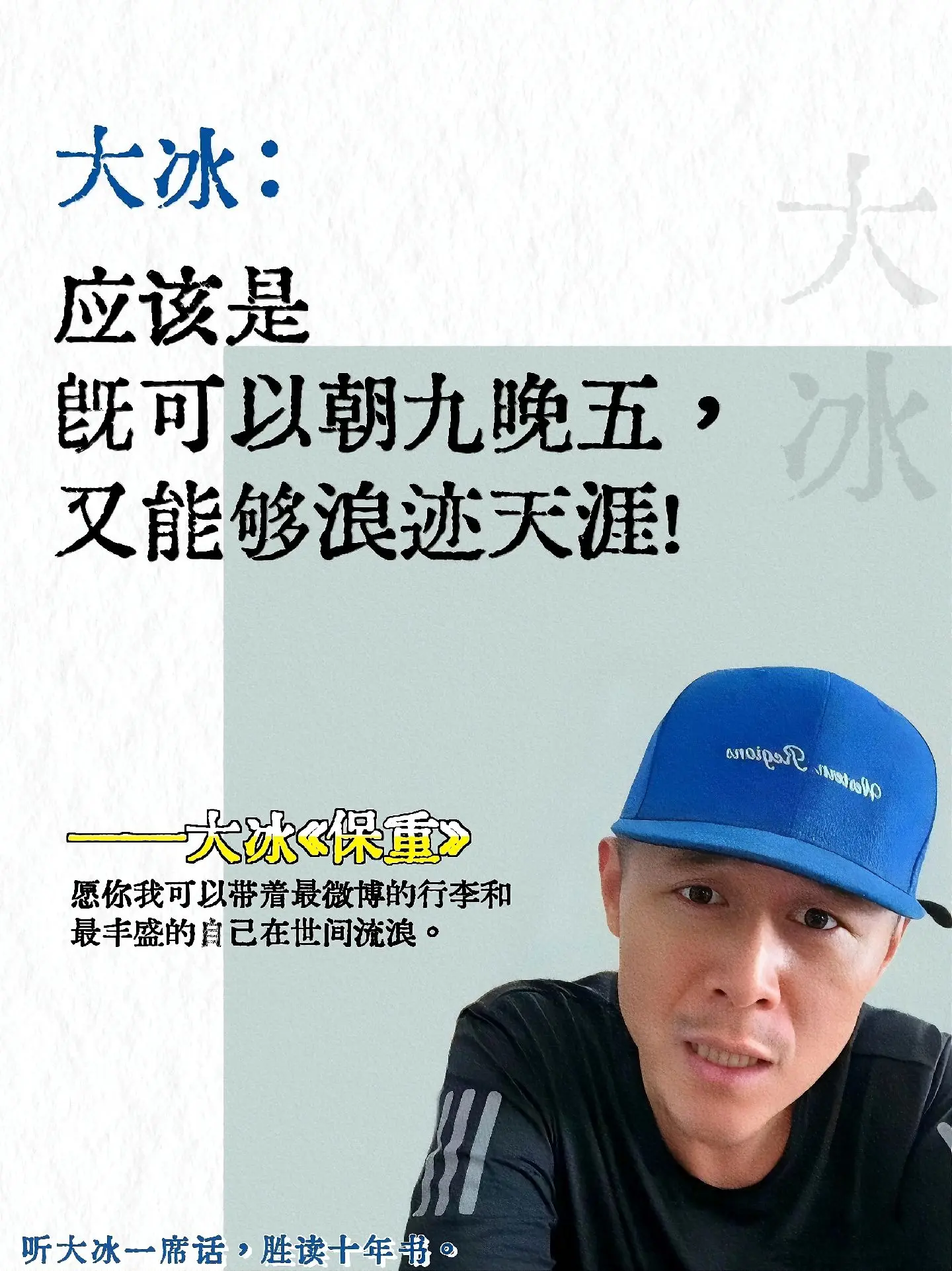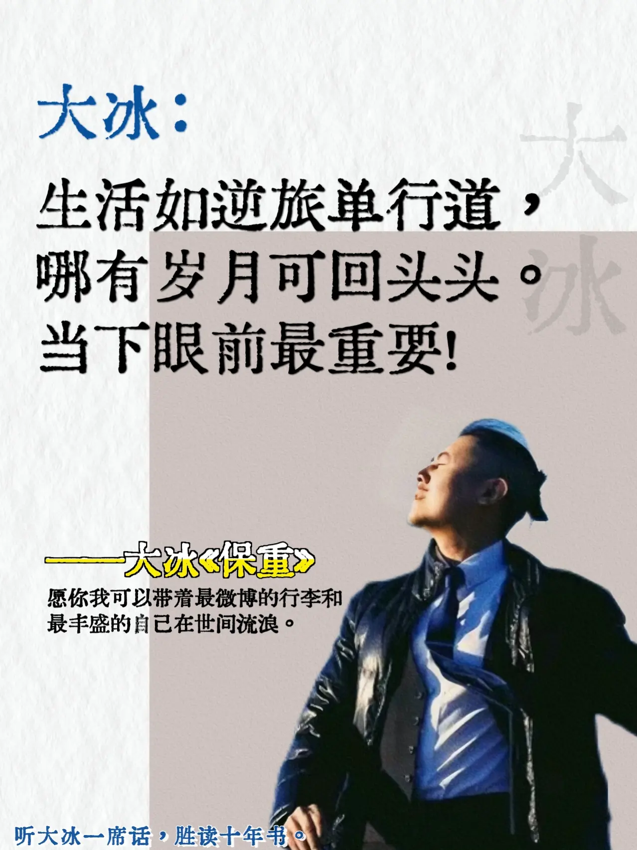 果然大冰太懂年轻人,彻底被治愈到了😭。为什么听过很多道理,却依然过不好这一生,大冰说:因为你只是听到了,没有去做到!扎心了😭,被他一句话彻底敲醒!人生如逆旅单行道,没有岁月可回头,把握好当下,珍惜眼前,脚踏实地一步步走下去,时间早晚会治愈你,但是你还是得自救!愿你我可以带着微薄的行李和丰盛的自己在世间流浪!