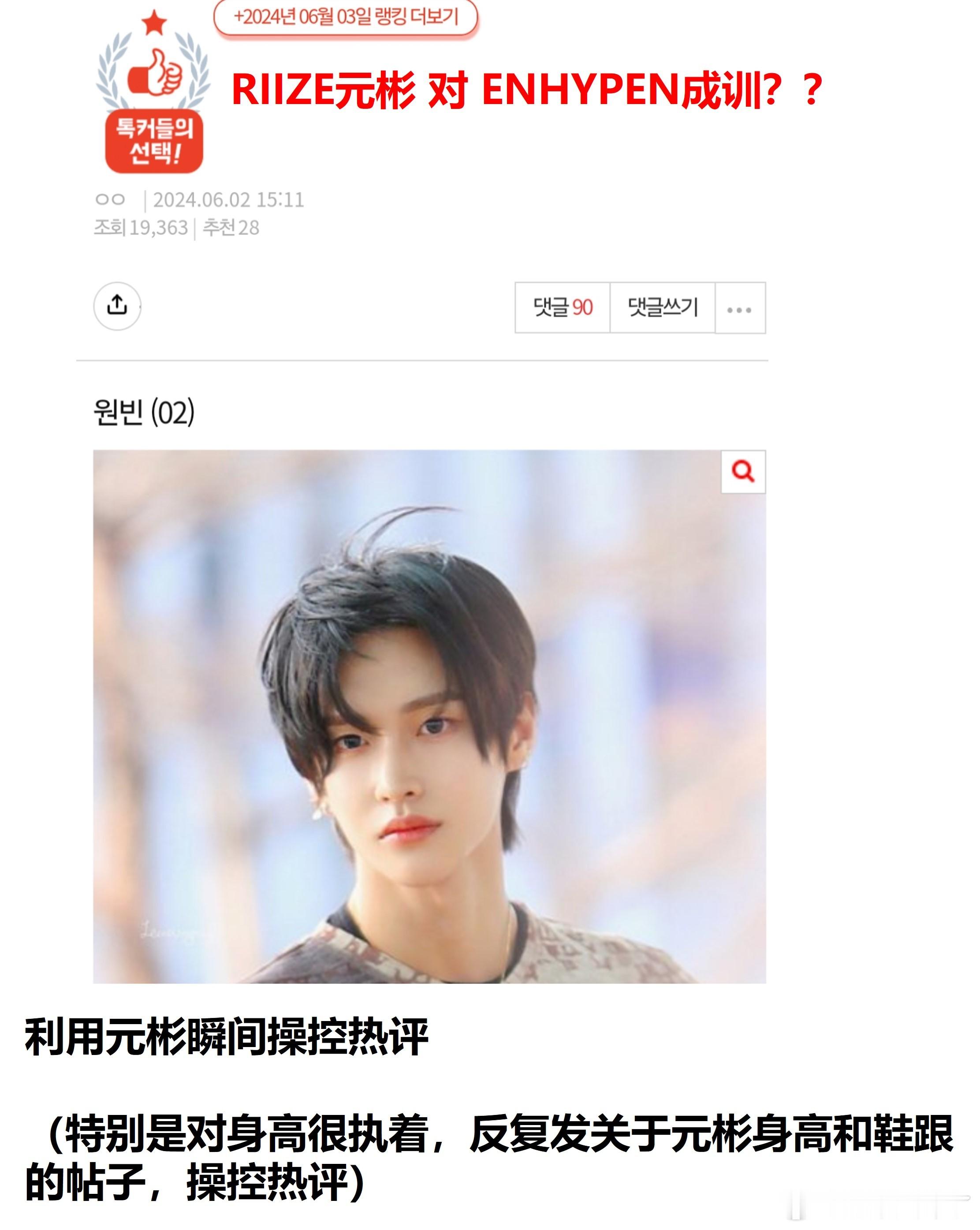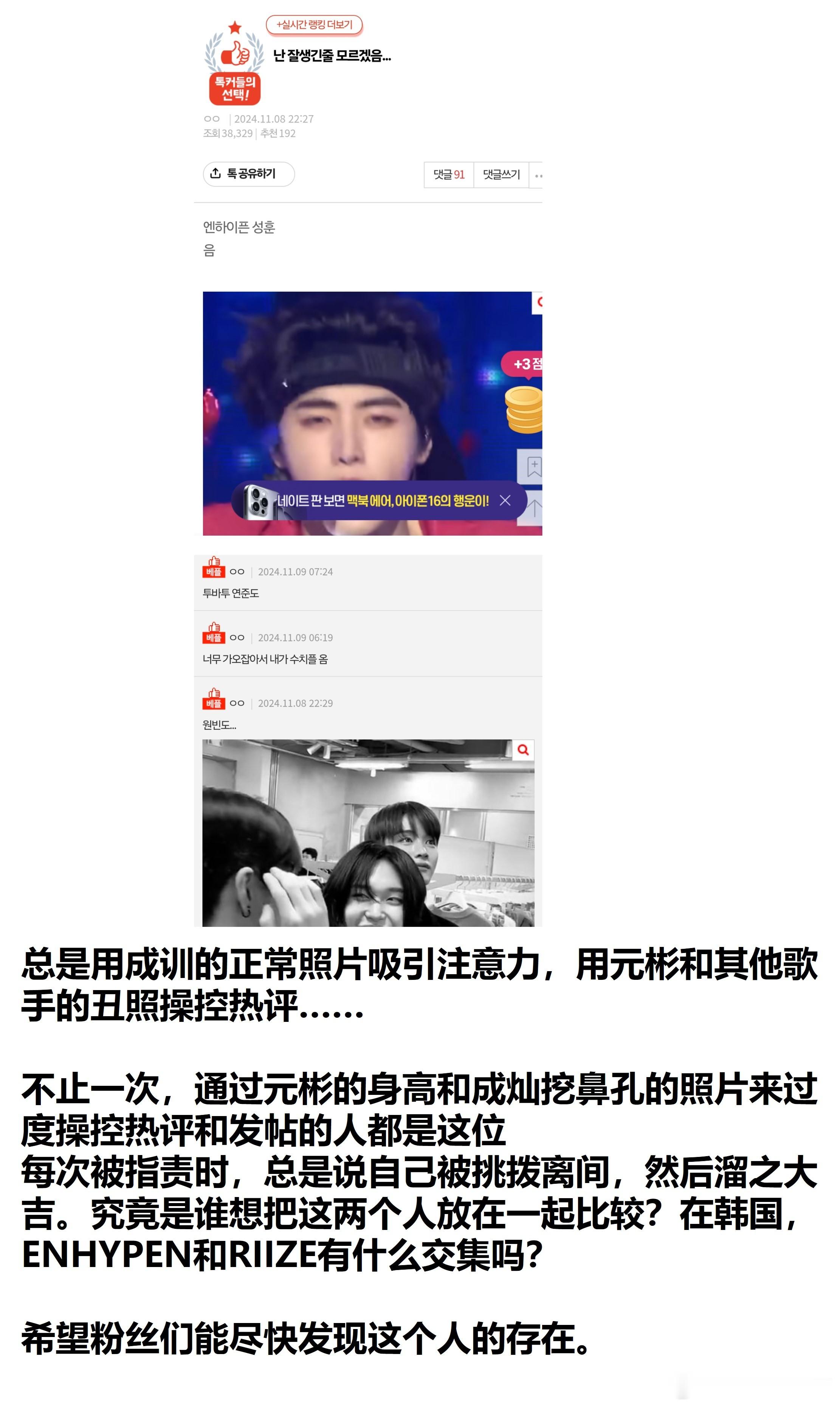 原楼主表示有一个老是利用RIIZE元彬和成灿来宣传成训的人,不知道在nh RIIZE 和 ENHYPEN能有什么交集,希望Breeze注意到。