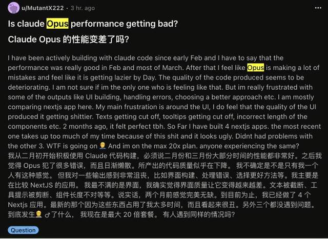 但很快,在Reddit的Claude社区里,类似的反馈开始密集出现,而且描述高度一致:
