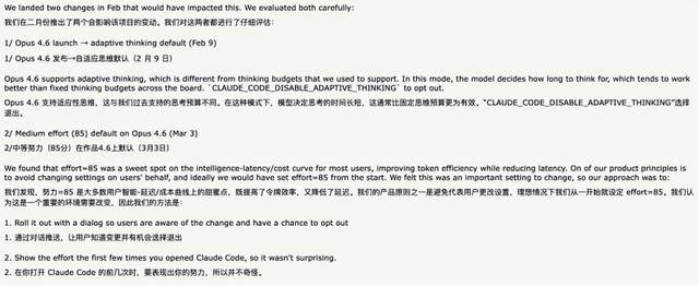 Claude Code的开发负责人Boris给出的解释是,这些变化来自系统层的调整:包括工具调用方式、推理策略以及资源分配机制的变化,而不一定是模型本身能力的下降。