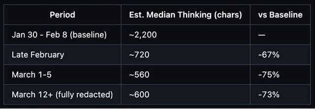 真正让讨论升级的是这个数字:有人在Claude Code的使用过程中,对历史交互日志进行对比,发现模型在复杂任务中的推理过程明显缩短,自2月更新以来,推理深度下降了67%。