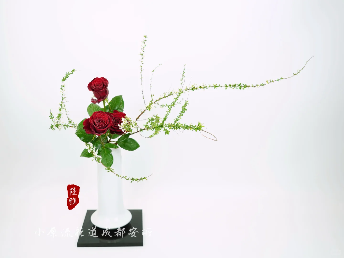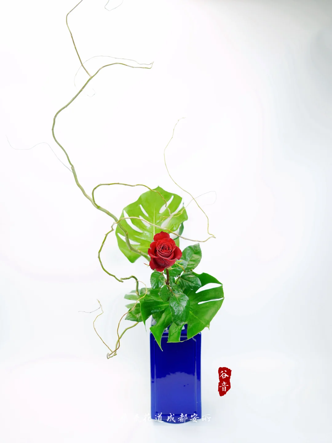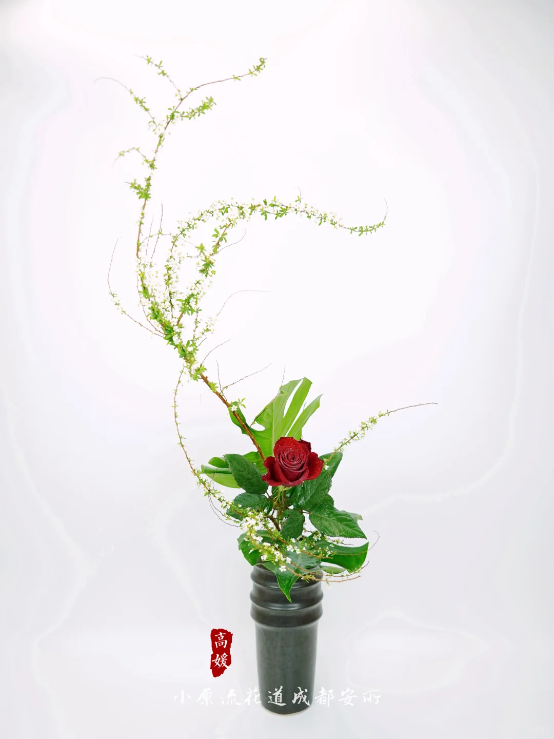 枝条纤细,增加了长度,很好的利用,跳跃灵动,仿佛随风而舞,舒展而大气!白黑色花器,中和玫瑰的红色,使主客融合,有春色盎然之感。