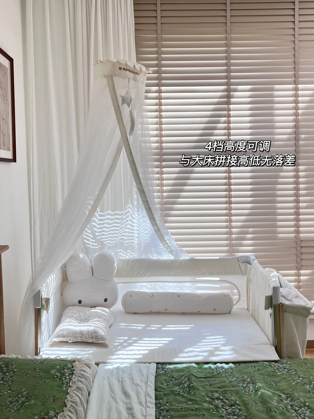 🟢四档高度调节,可以无缝拼接所有类型的大床,加宽的侧护栏延伸版完全不用担心会卡到宝宝肉肉~也不用担心床会向外滑,固定带一绑,两个床更紧密🫴🏻