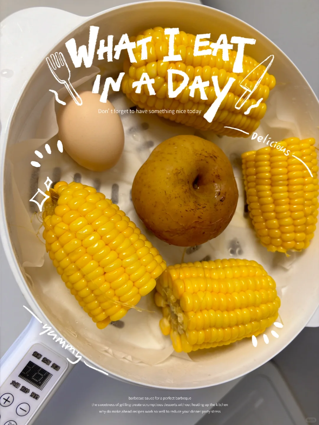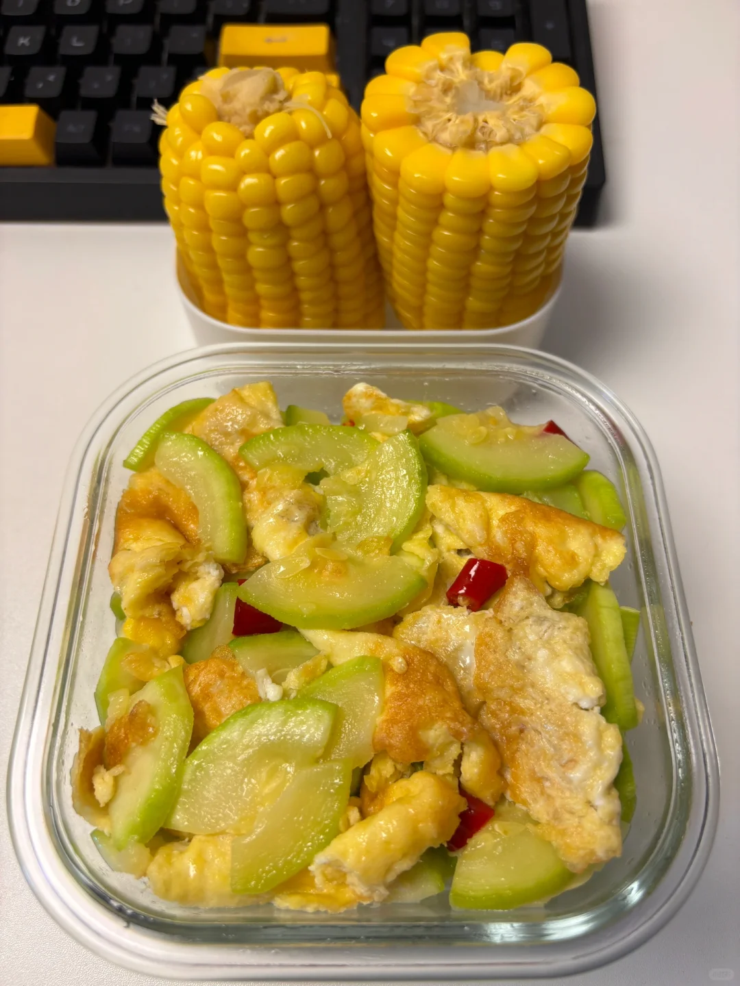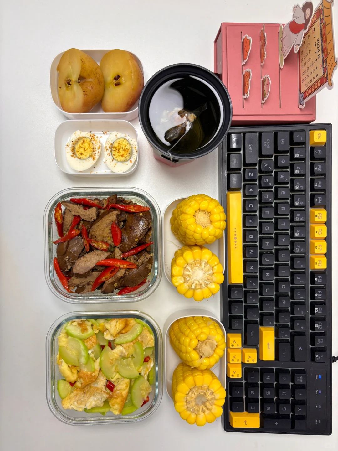 1⃣️早:蒸苹果、鸡蛋、茶(1.7💰) 2⃣️中:爆炒鸡肝、玉米(2.6💰) 3⃣️晚:西葫芦炒蛋、玉米(3.2💰) 合计:7.5💰