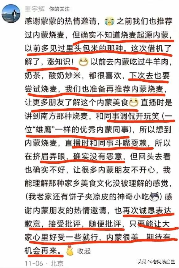 董老师的心胸宽广如海洋,格局宏大似天地。他被骂了,还给卖产品。潇潇说董老师特地交待了她们,好好讲讲内蒙古的烧卖。潇潇和小贝一起讲了15分钟烧卖,陪小贝加班半个小时才下播。 董老师11月6号在内蒙文旅评论区留言道歉,这两天网上都在转载。但是,大家万万也想不到,今天链接就上了内蒙烧卖。而且,董老师还特地交待了潇潇,让她们好好讲品。董老师的格局让人敬佩,但是很多粉丝朋友却想😭。这孩子,善良到让人心疼[比心][比心][比心]#董宇辉# #与辉同行#
