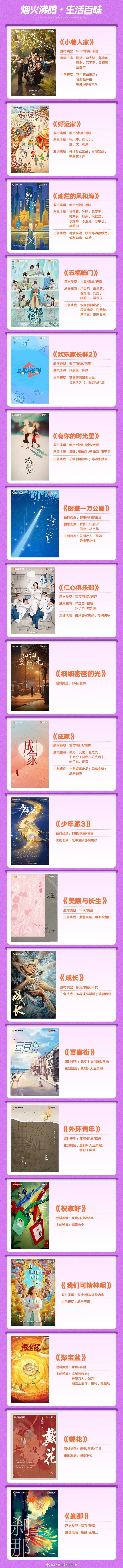 小巷人家、好运家、灿烂的风和海、五福临门、欢乐家长群2、有你的时光里、时差一万公里、仁心俱乐部、细细密密时光、成家、少年派3、美顺与长生、成长、喜宴街、外环青年、祝家好、我们可精神呢、聚宝盆、戴花、刹那