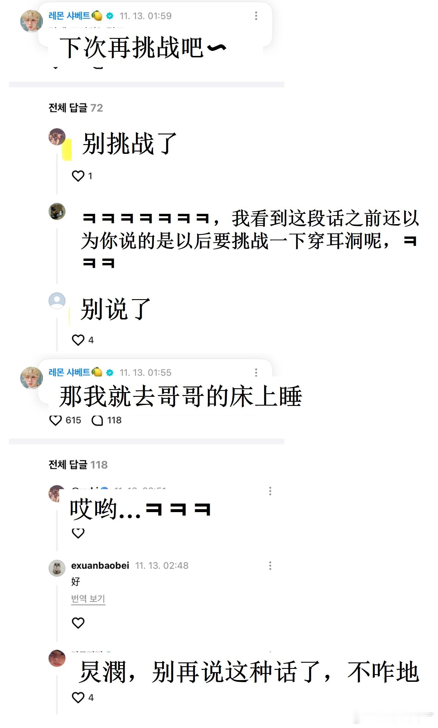 帖子主体内容差不多,图1是TWS成员(草莓是队长申惟 柠檬是忙内炅潣)的对话,忙内撒娇要去队长床上睡,失败还在语言上装哭(这些对话粉丝都能看到)