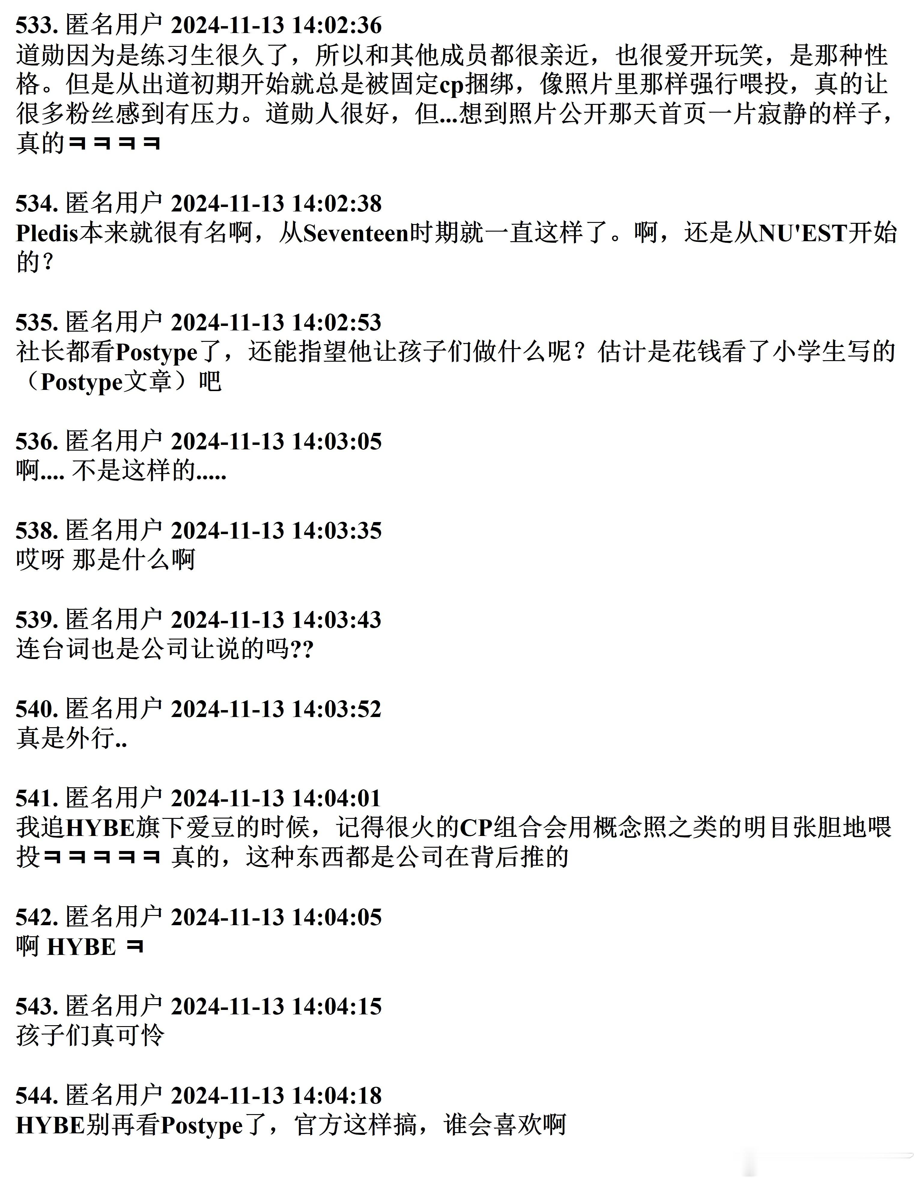 (还有一个差不多内容差不多时间发的名为被指责“不懂粉丝”的 HYBE 男团“套路” 热帖,刷新的时候无了,但是评论内容也和800楼差不多)