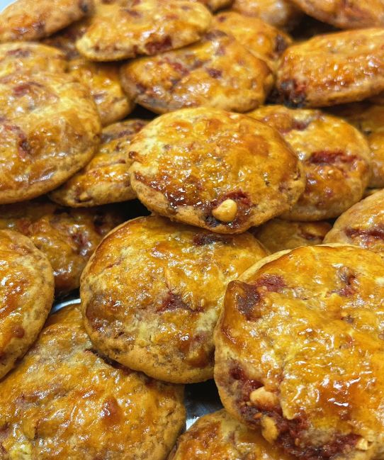 刚出炉的港饼香气能飘半条街。芝麻被烤得焦黄,一碰就掉渣。掰开港饼,能看到里面的冰糖已经融化成透明的糖浆,橘饼的红色星星点点。咬一口,外皮酥脆,内馅绵软,冰糖的甜、芝麻的香、桂花的清、橘饼的酸,各种味道在嘴里打架。最妙的是那些没完全化掉的冰糖颗粒,嚼起来咯吱咯吱的,像吃糖粒。