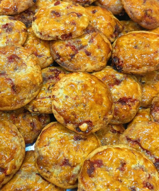 做港饼最讲究的是和面。面团里要加饴糖和熟猪油,揉到光滑不粘手,醒发后擀成薄皮,包入馅料。馅料里的冰糖是粗颗粒的,咬起来嘎嘣脆,橘饼和桂花提供果香,红绿丝虽然被很多人嫌弃,但老黄石人说没有红绿丝就不是正宗港饼。包好馅的面团压成饼坯,表面刷一层糖水,再密密麻麻地沾上白芝麻,放进烤炉里用中火烘烤。