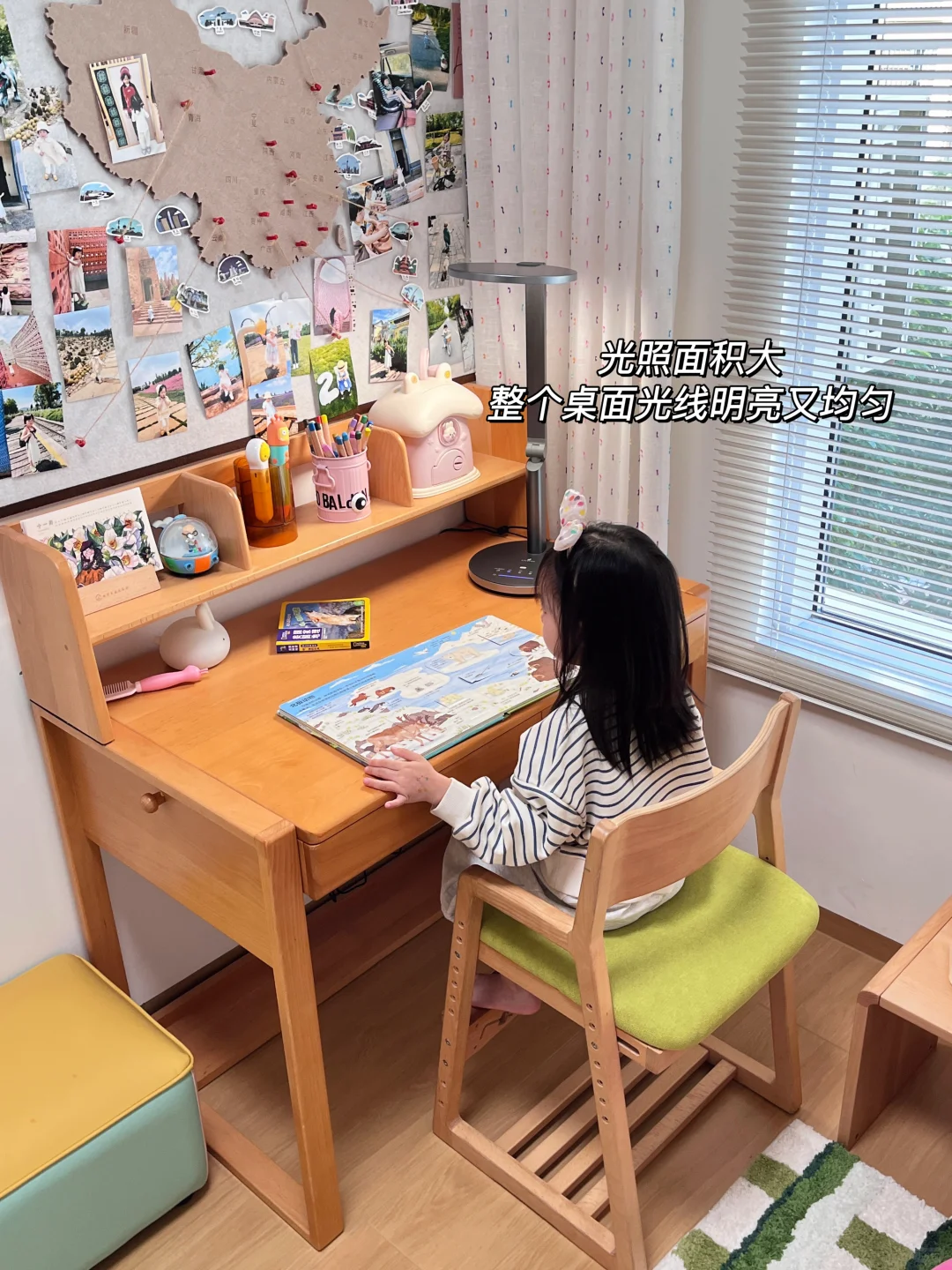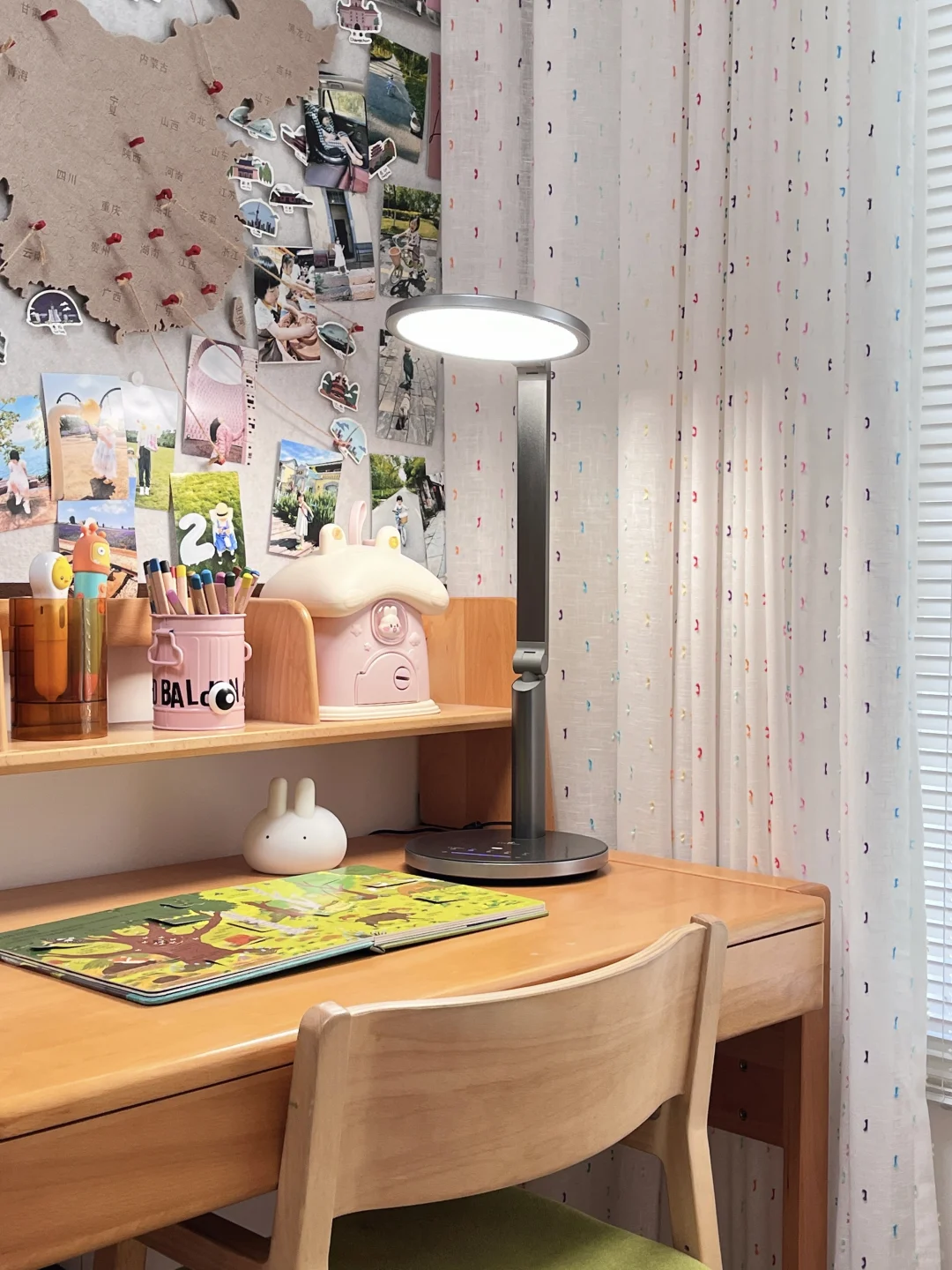 卧室不大,所以选了1米的学习桌,学习区没有搭配占地的大路灯!桌面放上孩视宝台灯非常够用了!关键是它光照面积大,明亮又均匀,书写、画画没啥手影,这样孩子近距离用眼不容易视疲劳。