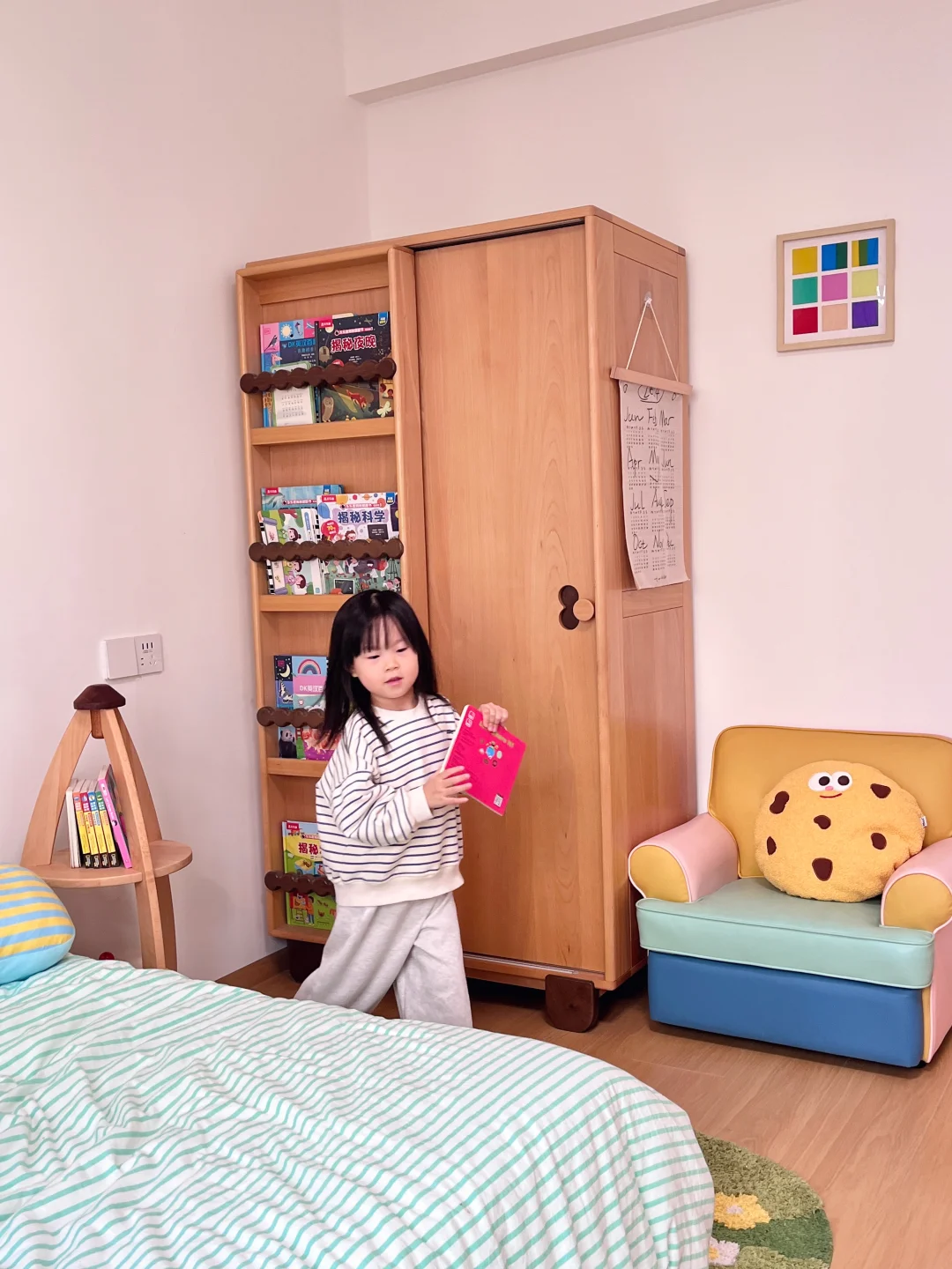 没有打柜子,安排了带绘本架的衣柜,既能收纳孩子衣物,又能当绘本架。