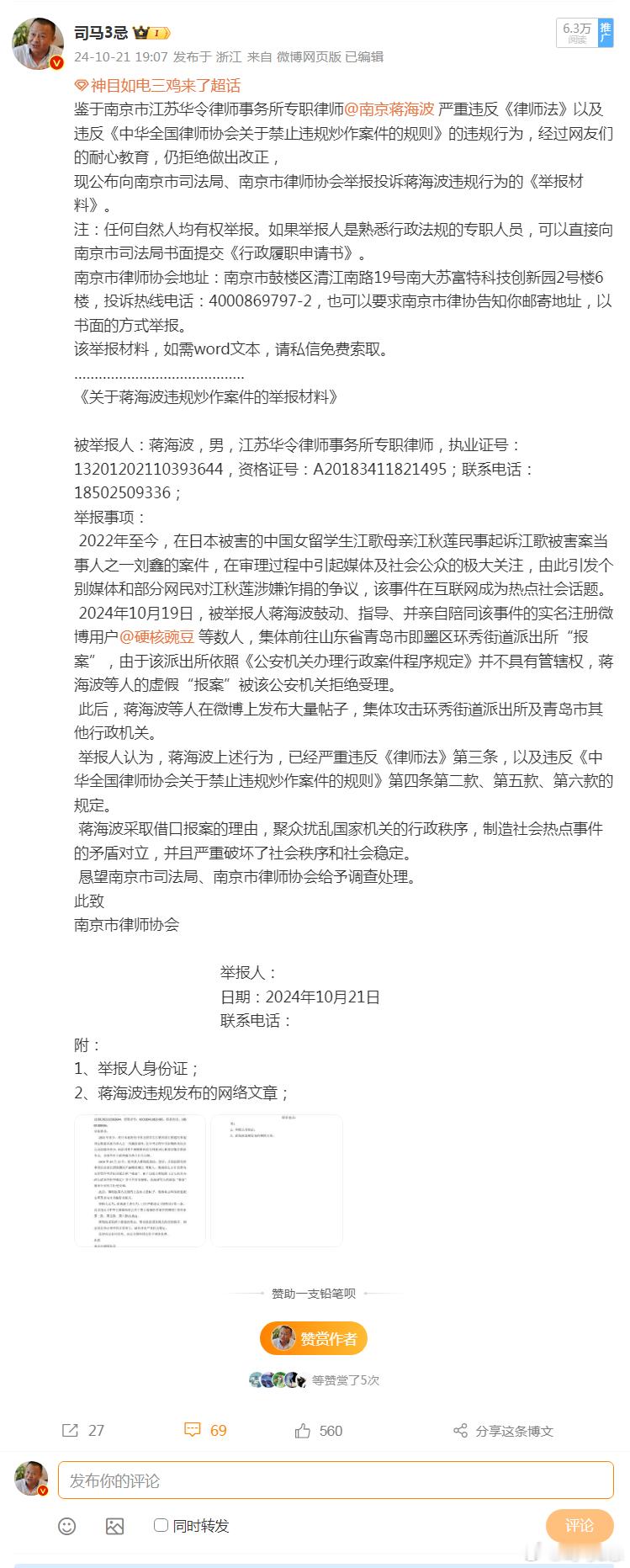 2024-10-21,本人发帖,针对江苏华令律师事务所专职律师蒋海波鼓动、指导、并亲自陪同微博用户等多人,集体前往山东省青岛市即墨区环秀街道派出所借口“报案”,聚众扰乱国家机关的行政秩序,制造社会热点事件的矛盾对立,违规炒作并且严重破坏了社会秩序和社会稳定,应该向江苏省南京市司法局、南京市律师协会投诉举报。