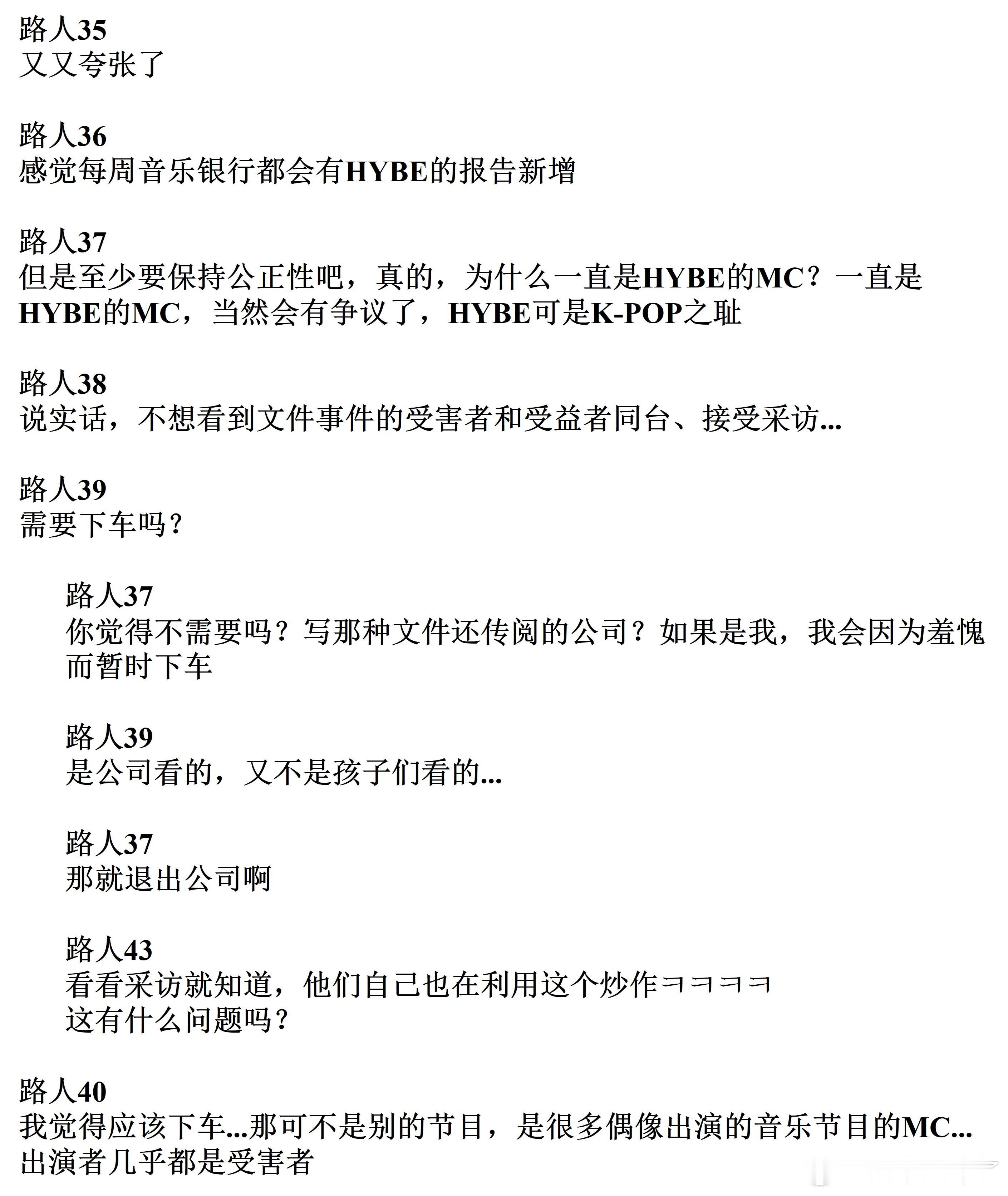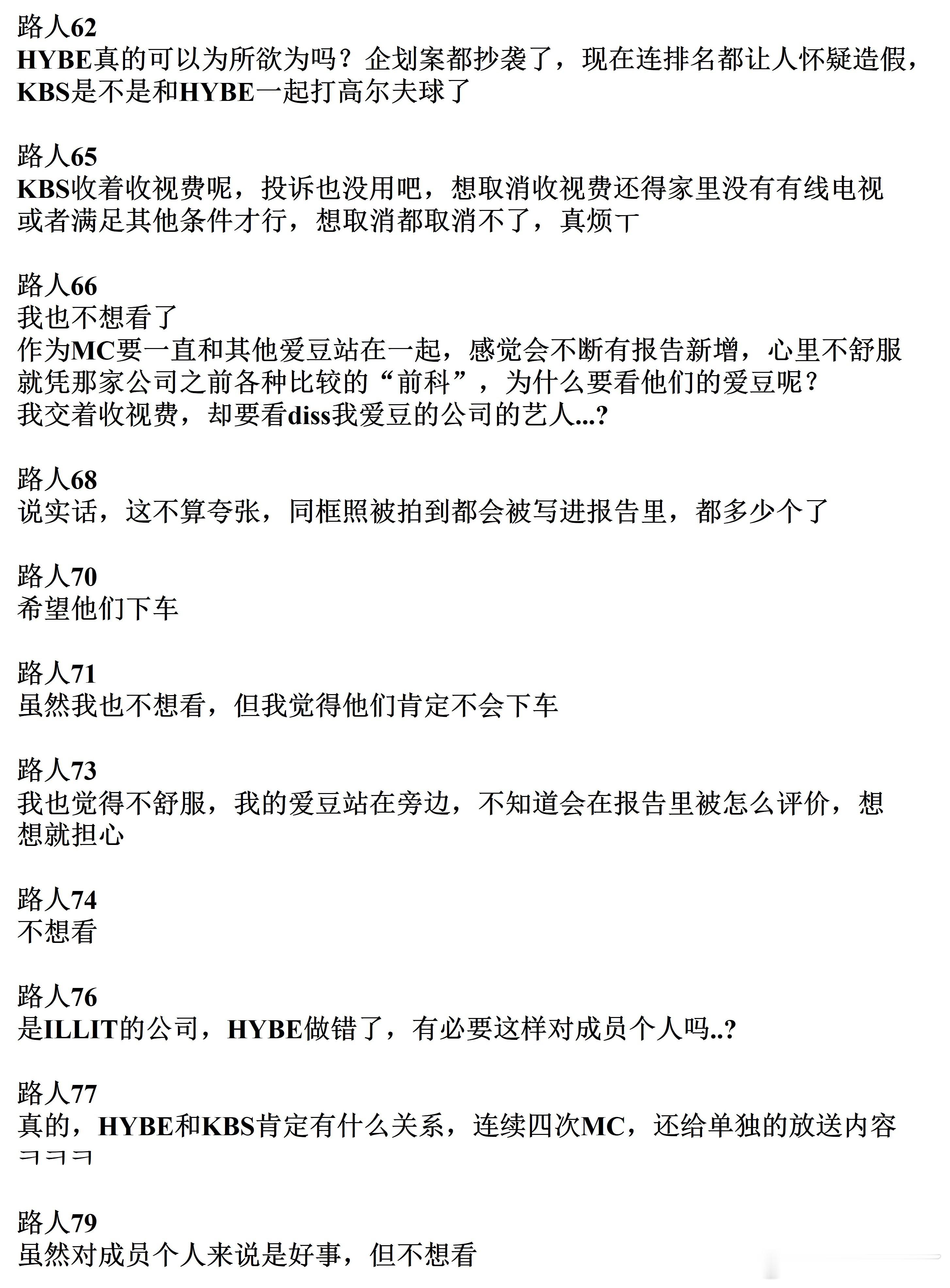 还有说要投诉,看看KBS和HYBE到底什么关系,连续4个MC都是HYBE的,不会也去打高尔夫了吧
